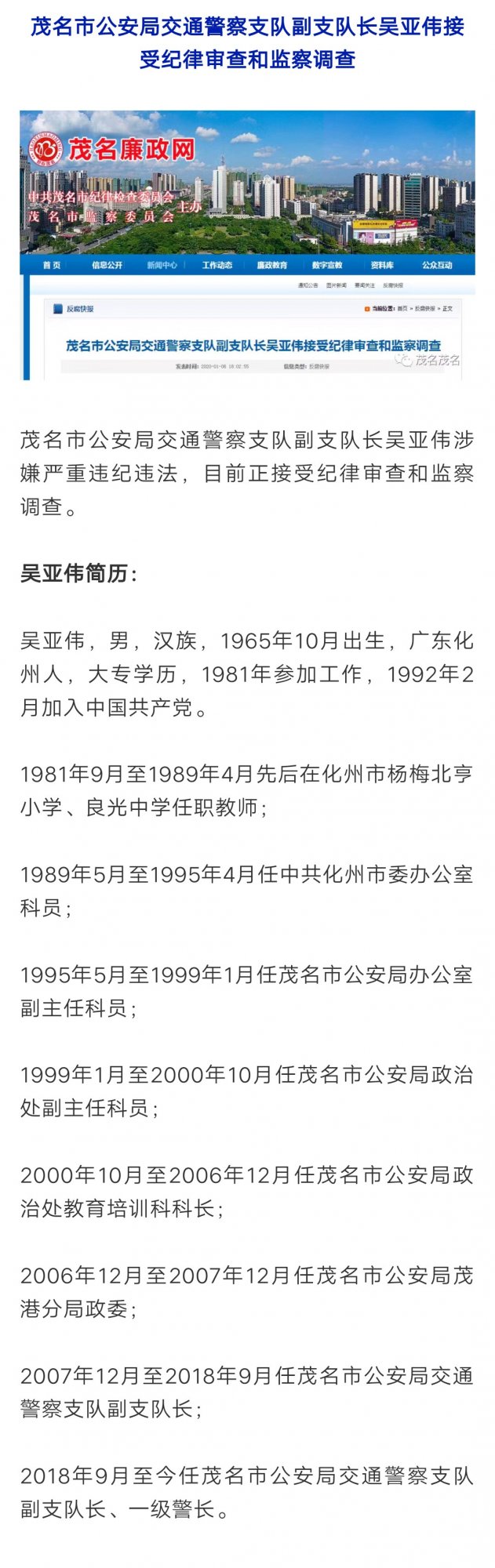 茂名市公安局交通警察支队两人接受纪律审查和监察调查 茂名网微茂名 今天 茂名市公安局交通警察支队副支队长吴亚伟接受纪律审查和监察调查 https://mp.weixin.qq.com/s/auWpGkrn4aPv3K-8ByM1Lw
