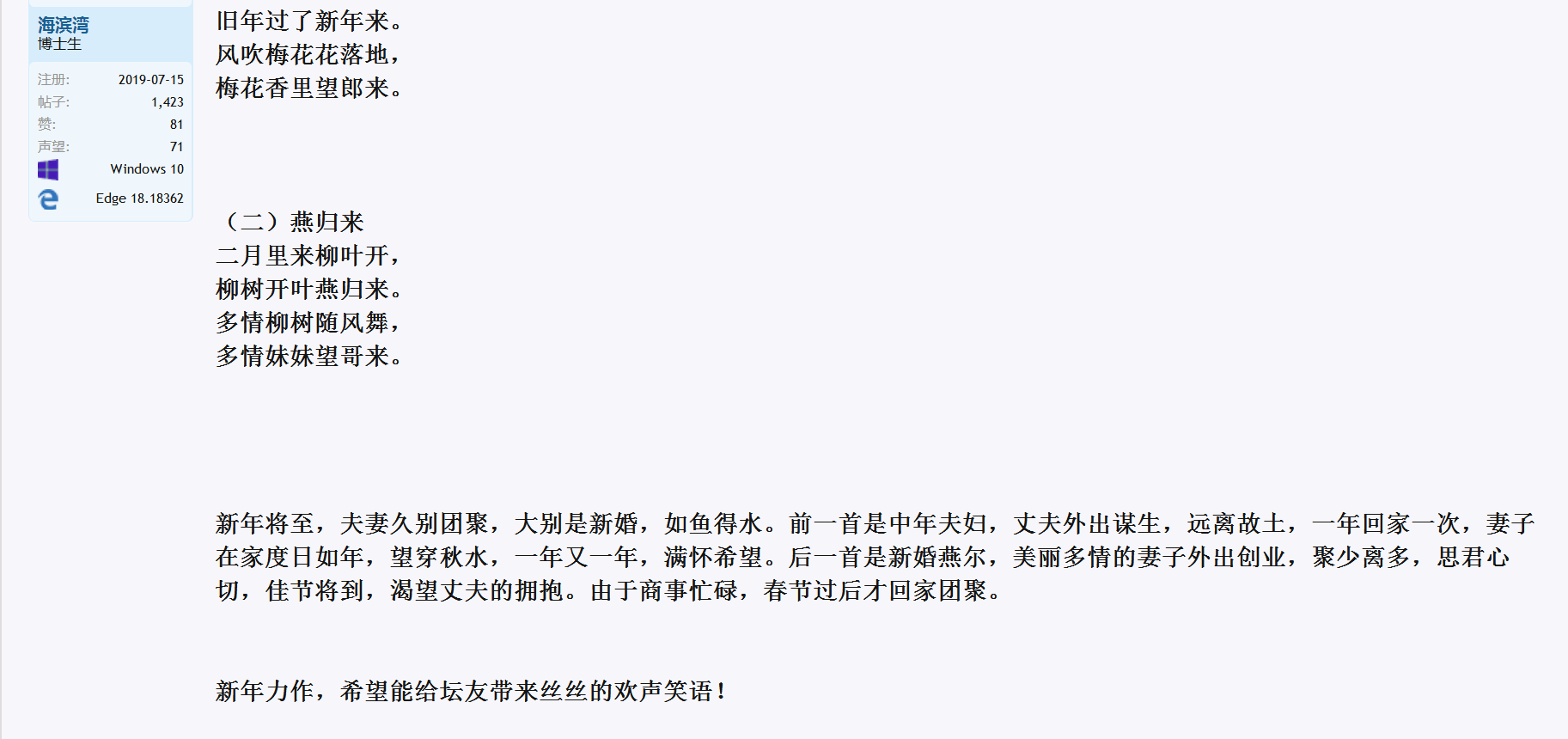 海滨湾都写了几十首诗词了,有二首是雷同的也正常,我知道我水平差,但是我不耻下问,虚心请教陈老师和汪副会长等等坛友,努力提高自己的写作水平,天天跟着汪会长写诗,我始终相信只要有恒心,铁棍磨成粉[FONT=黑体]哈! 做得![/FONT]