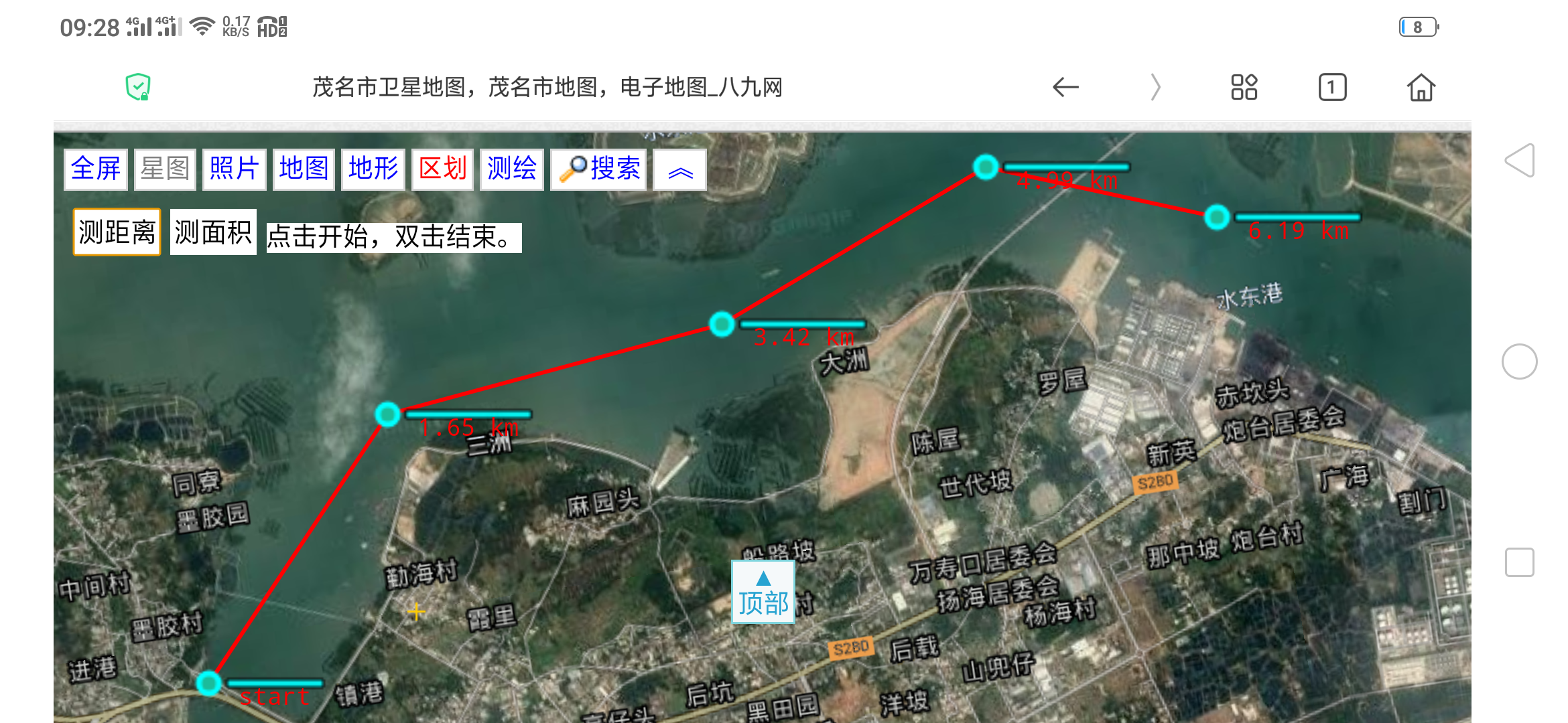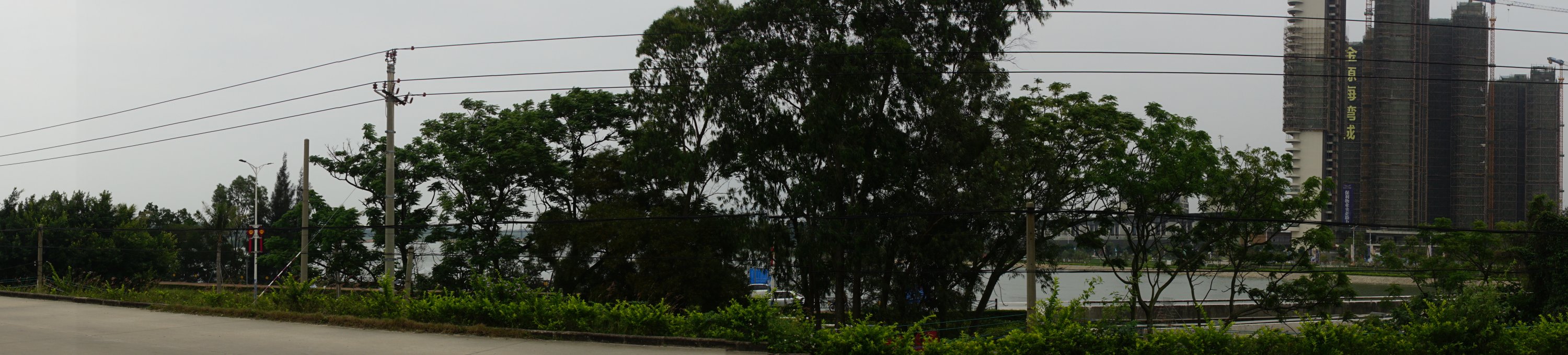 起点: 墨胶村,是处公路侧有草木种成的大字: 南海旅游岛,亦即歌美海(曾用名:割尾海)金源海湾城对面,传卫星图: