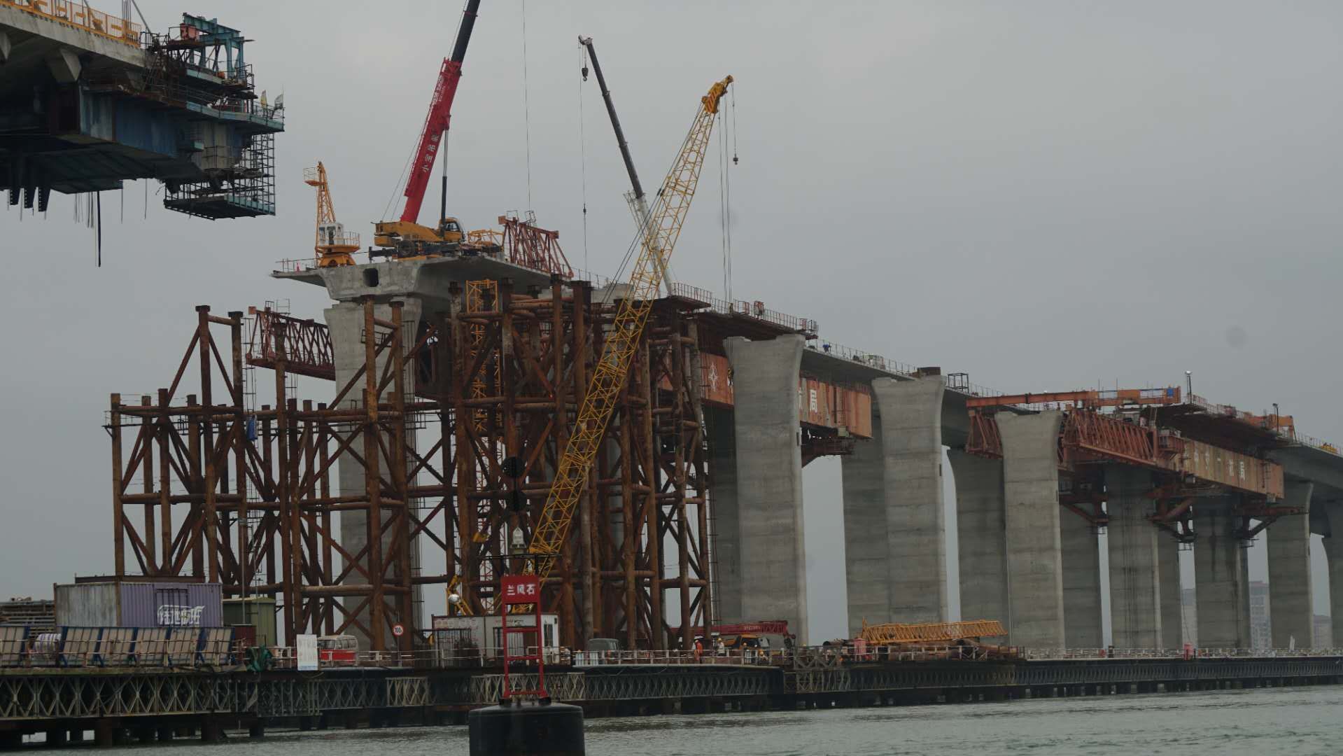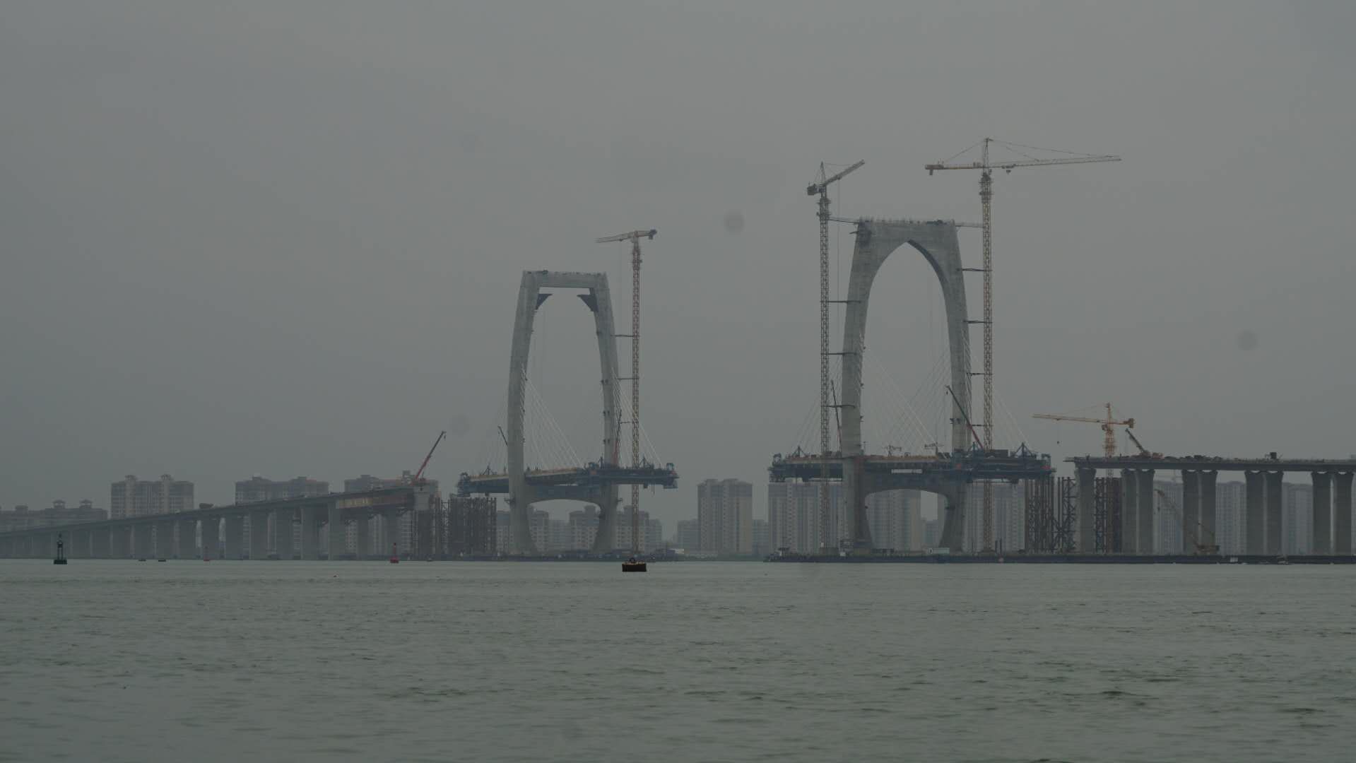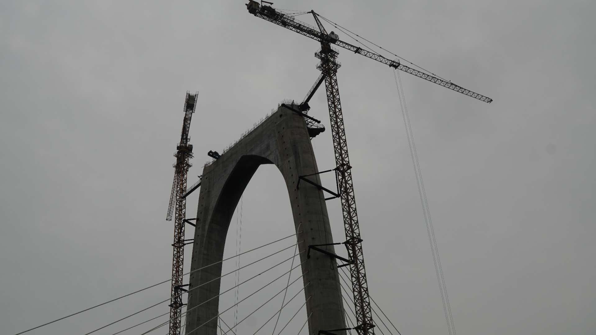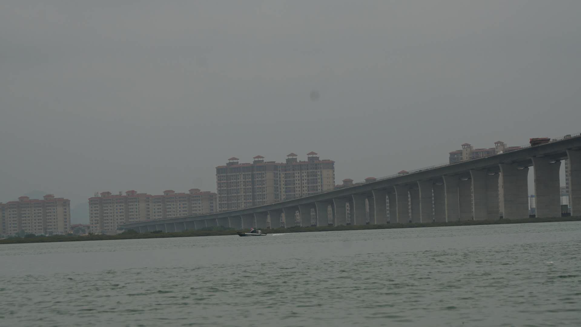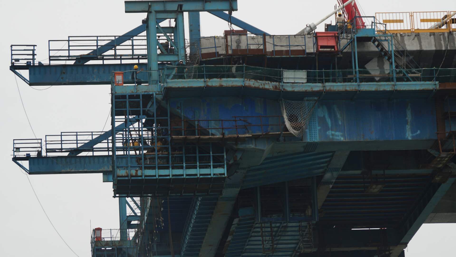 行至十里之后,大桥高大起来,拍图可见桥上施工员。