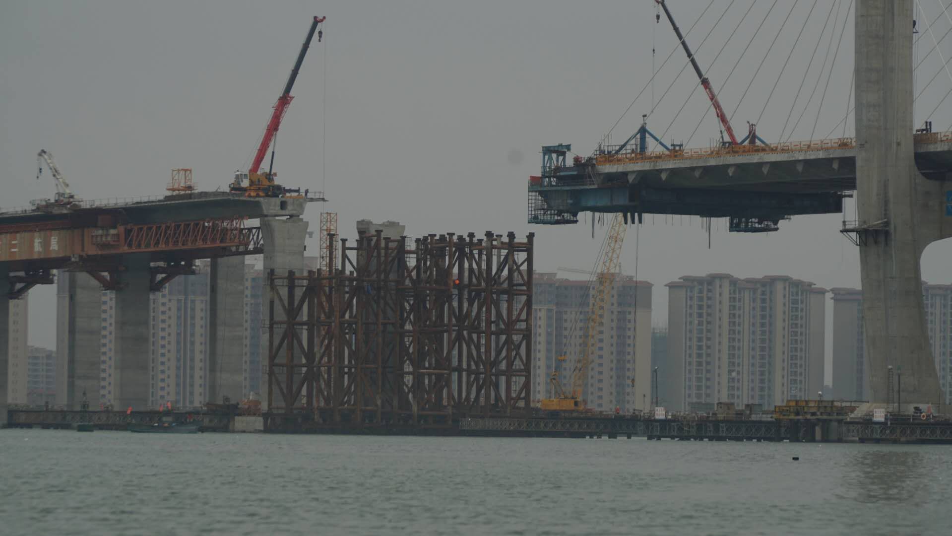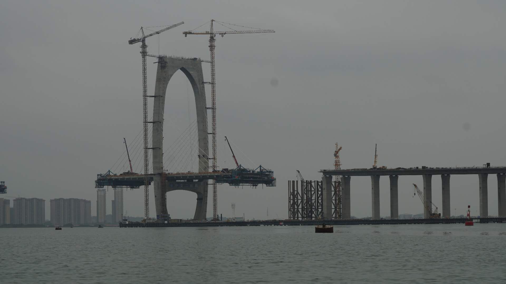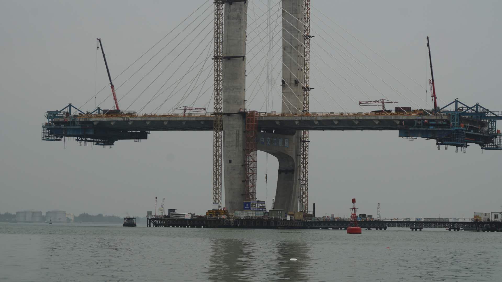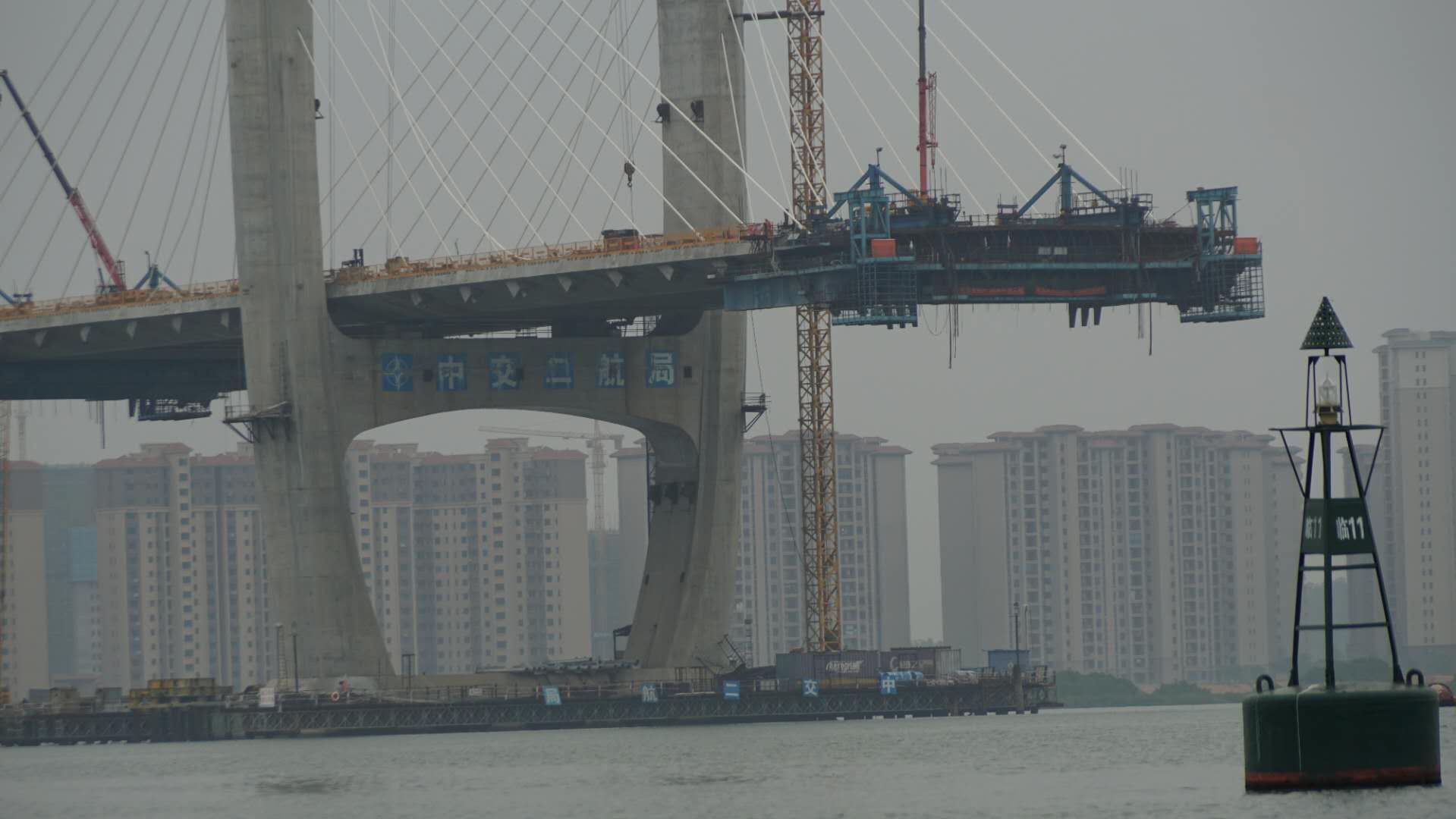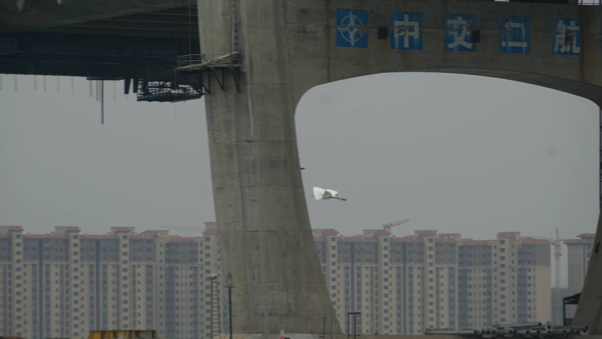 行至十里之后,大桥高大起来,拍图可见桥上施工员。