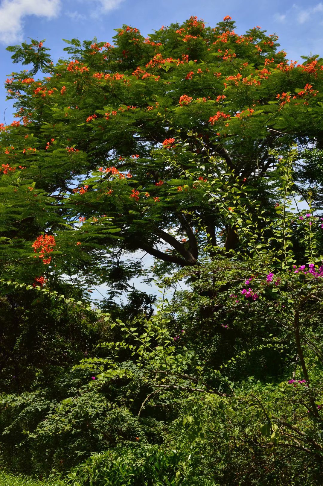 7月份爬上狮子岭的时候,看见了凤凰花、杜鹃花还在开,绿色、花朵把狮子岭装扮得环境宜人。