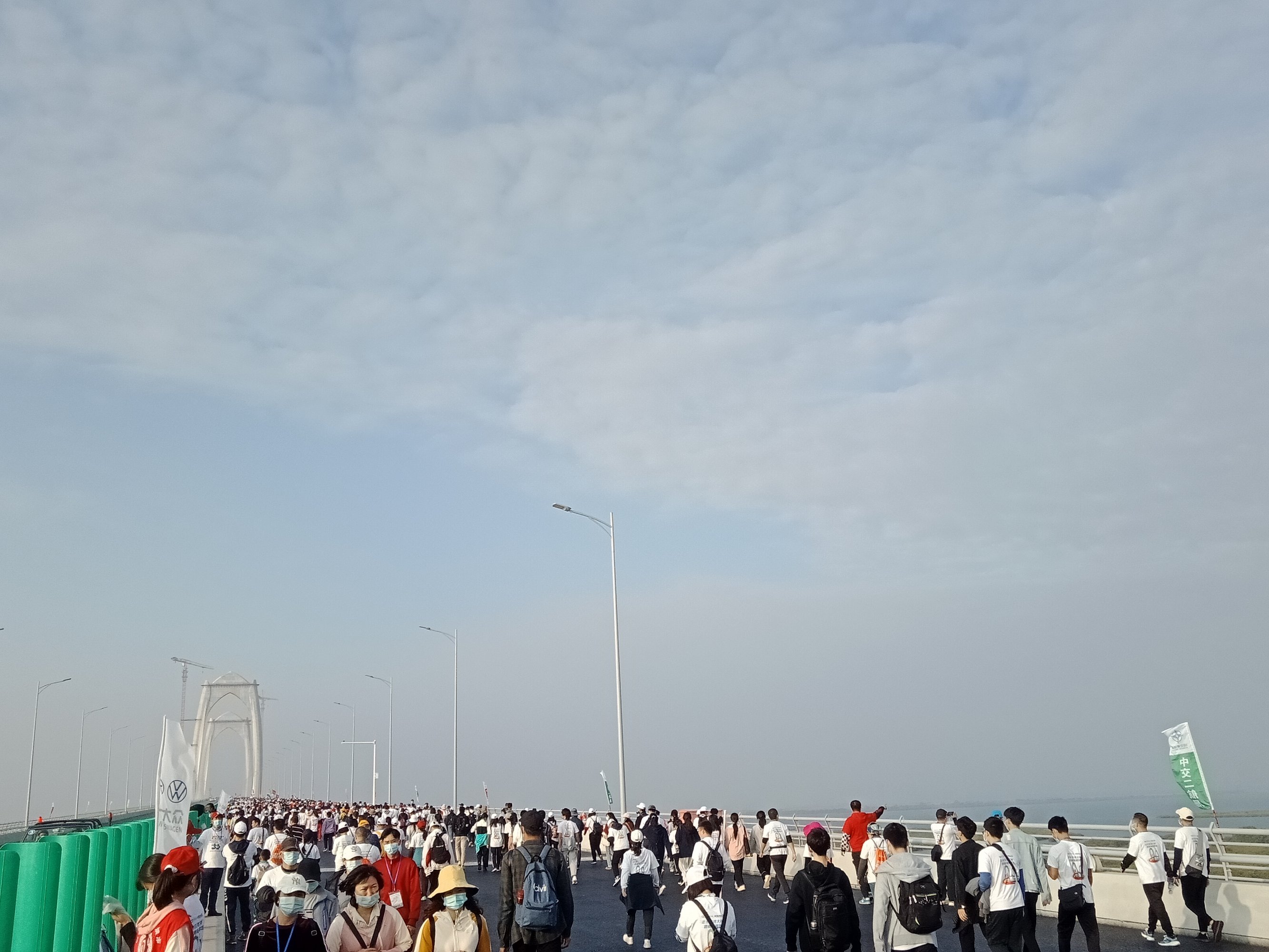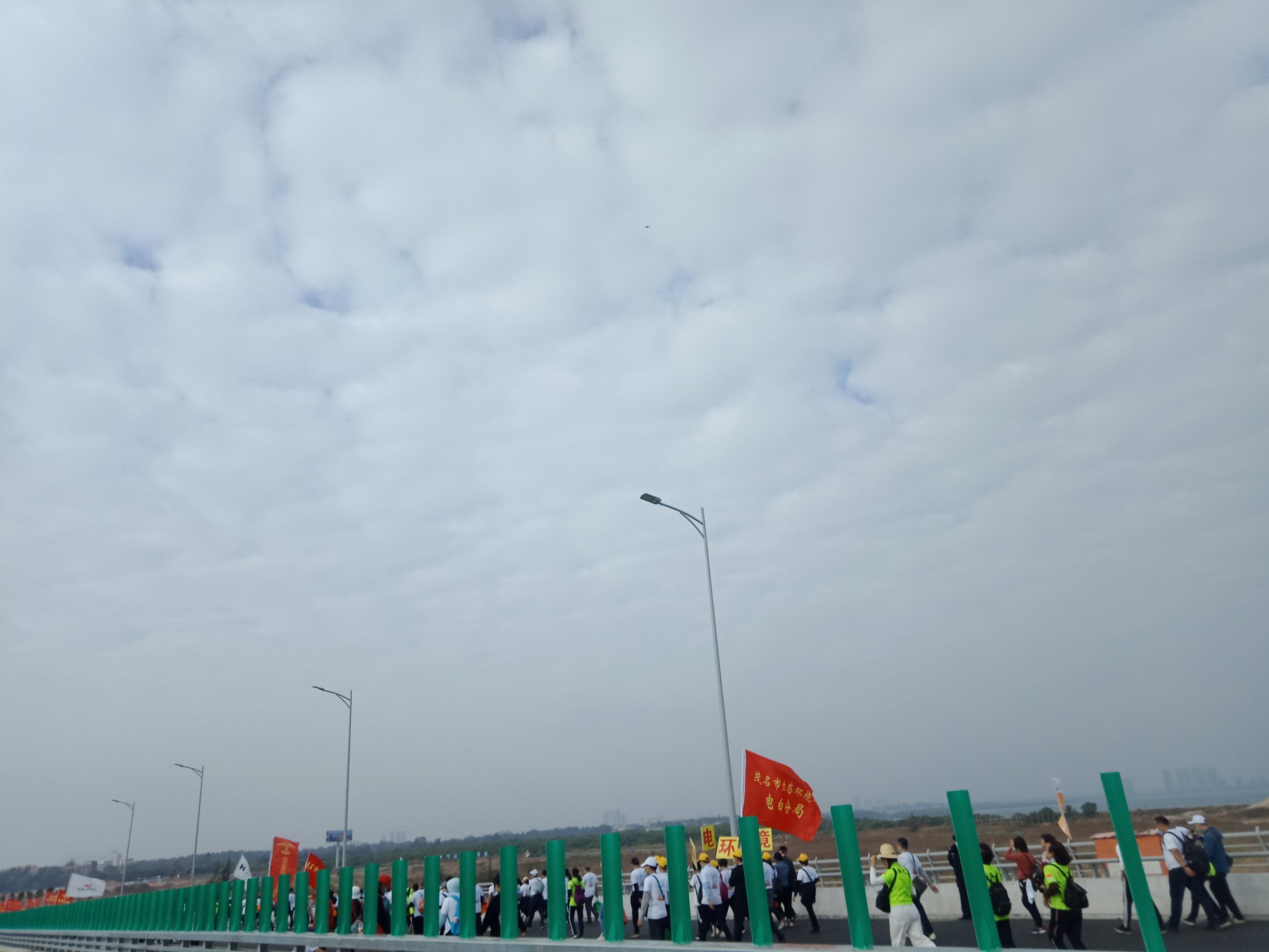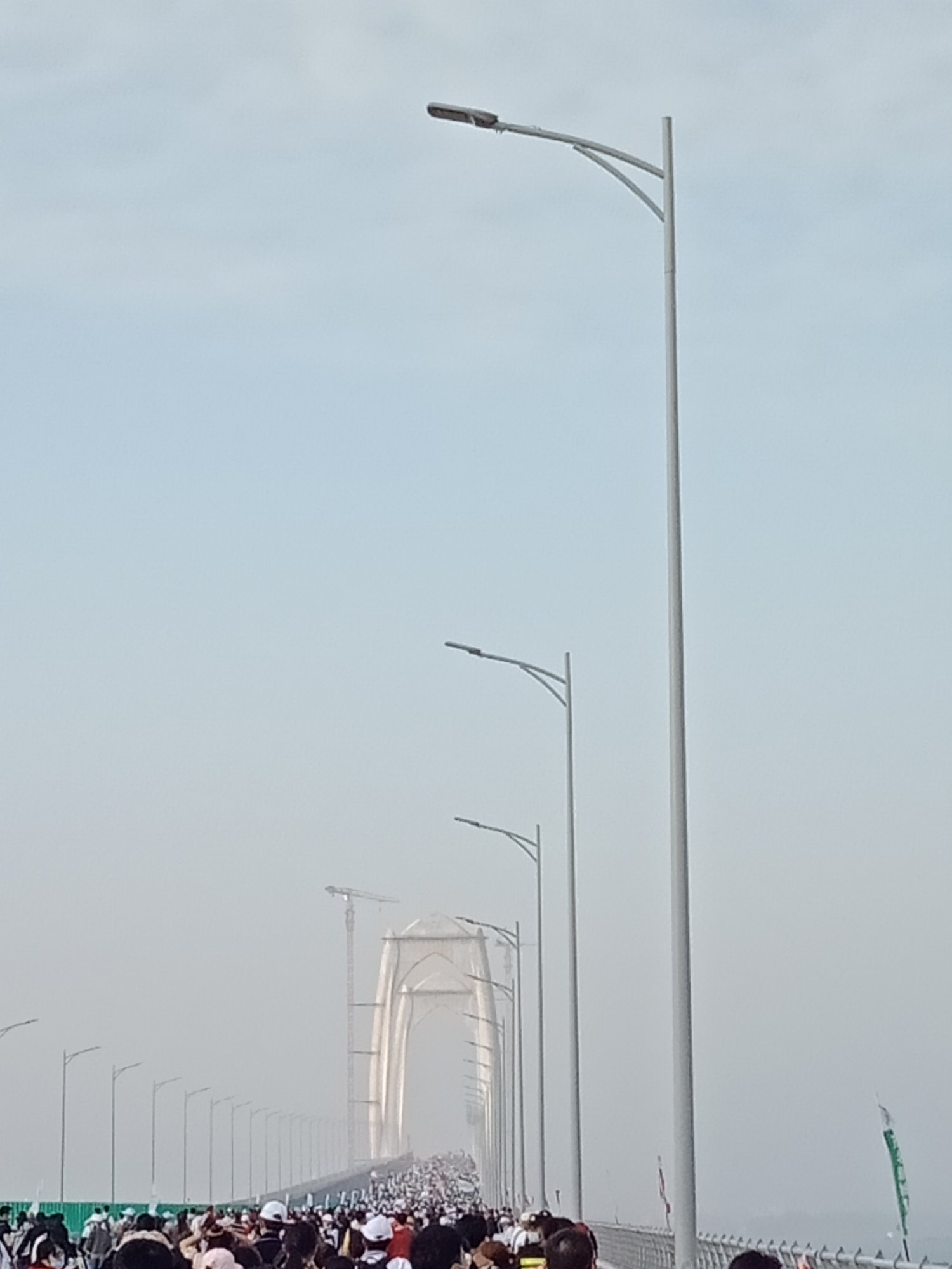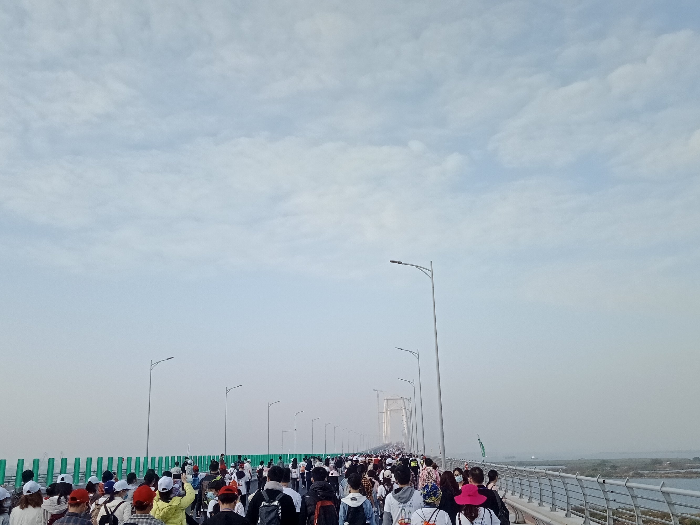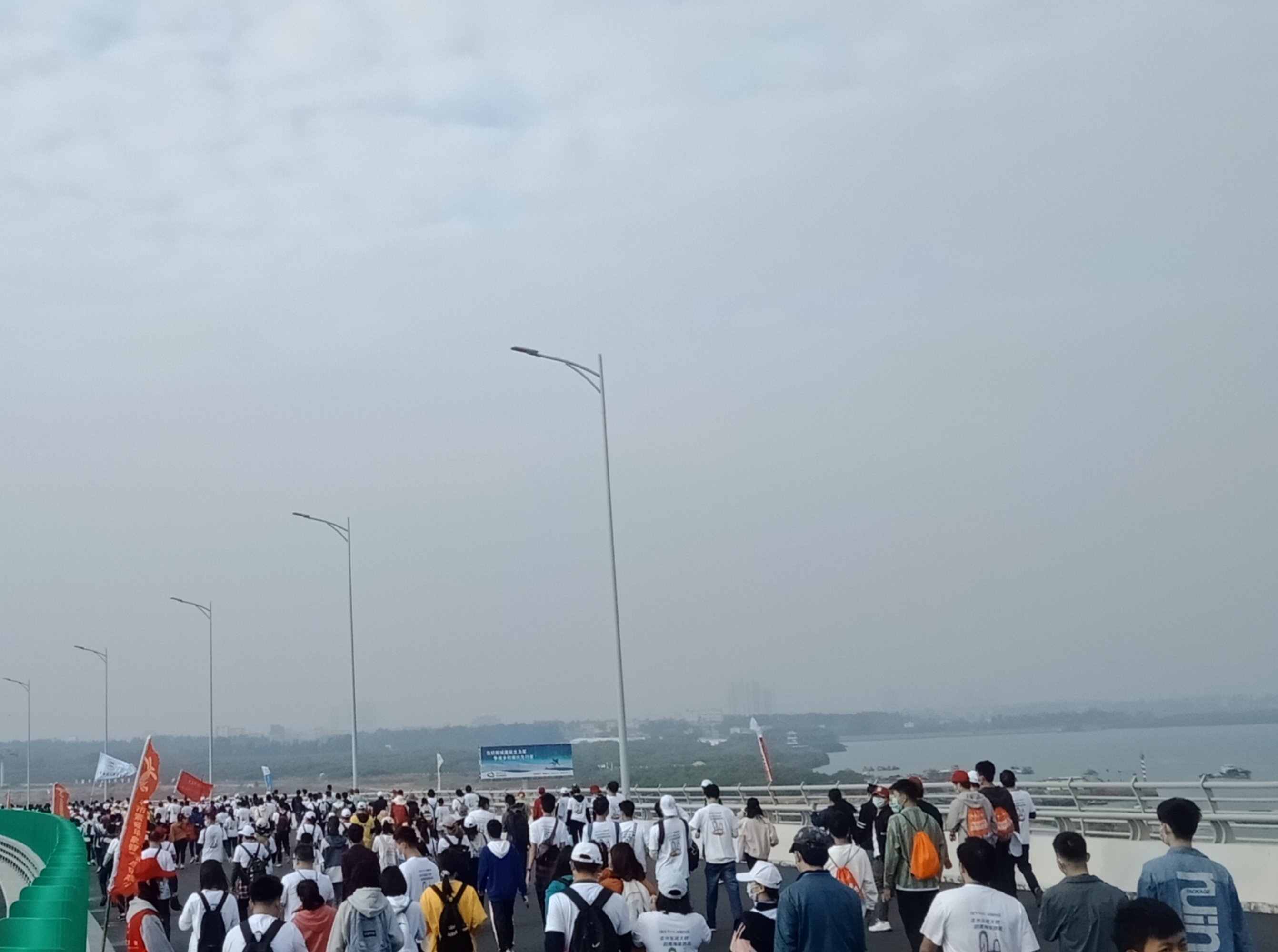 我早上将近七点钟就到了,我想看下有多少人参与,与看下人景,特别水东湾大桥上的人景,从起点一直走到可看见水东湾大桥上坡的位置,一眼望去已都是人影,而那个启动仪式好像是8点十几分才开始?为了一睹已占先偷步的水东湾大桥上的人景,我也没有看启动仪式,经过那启动仪式平台时,只看到还在演练