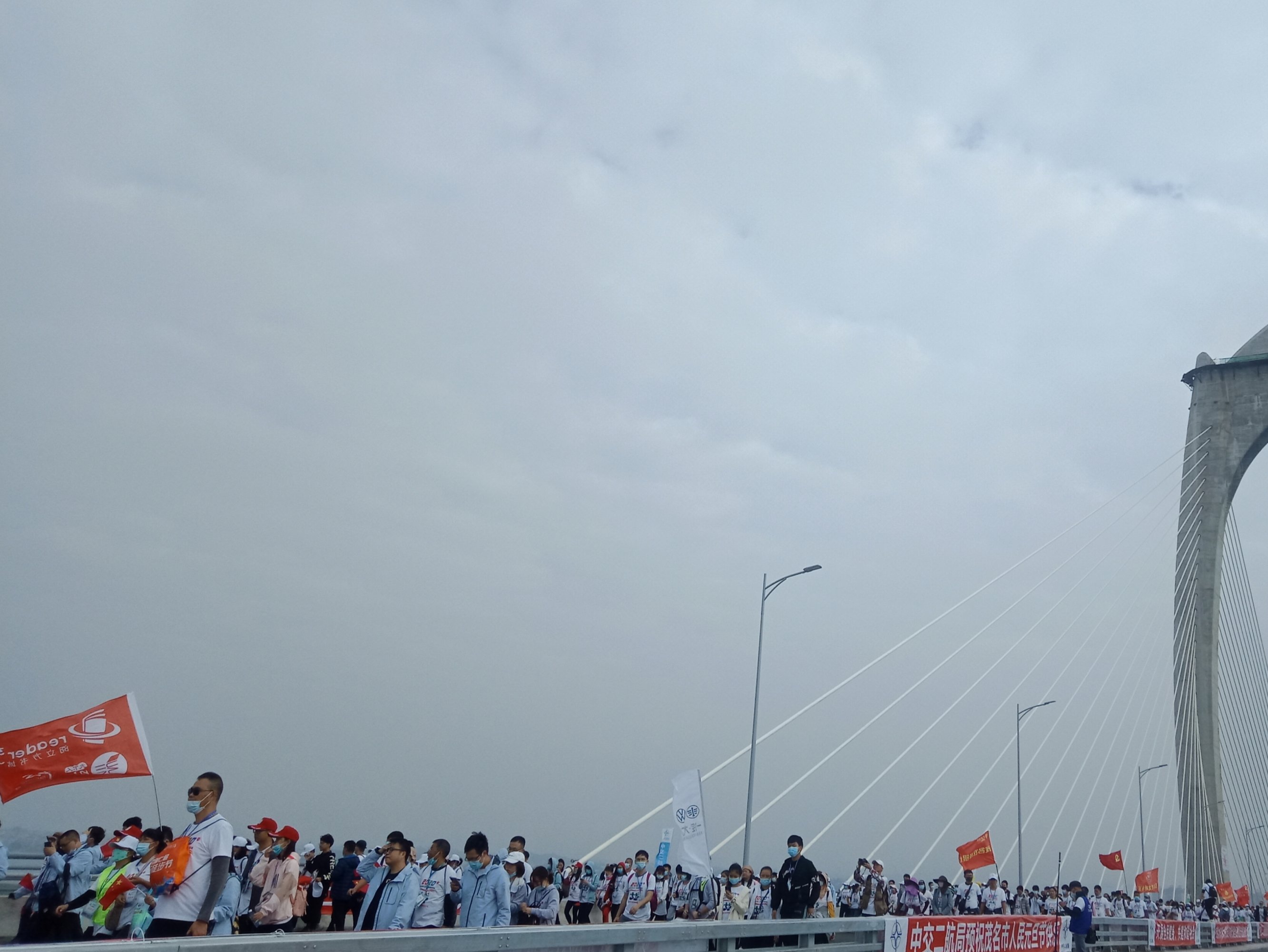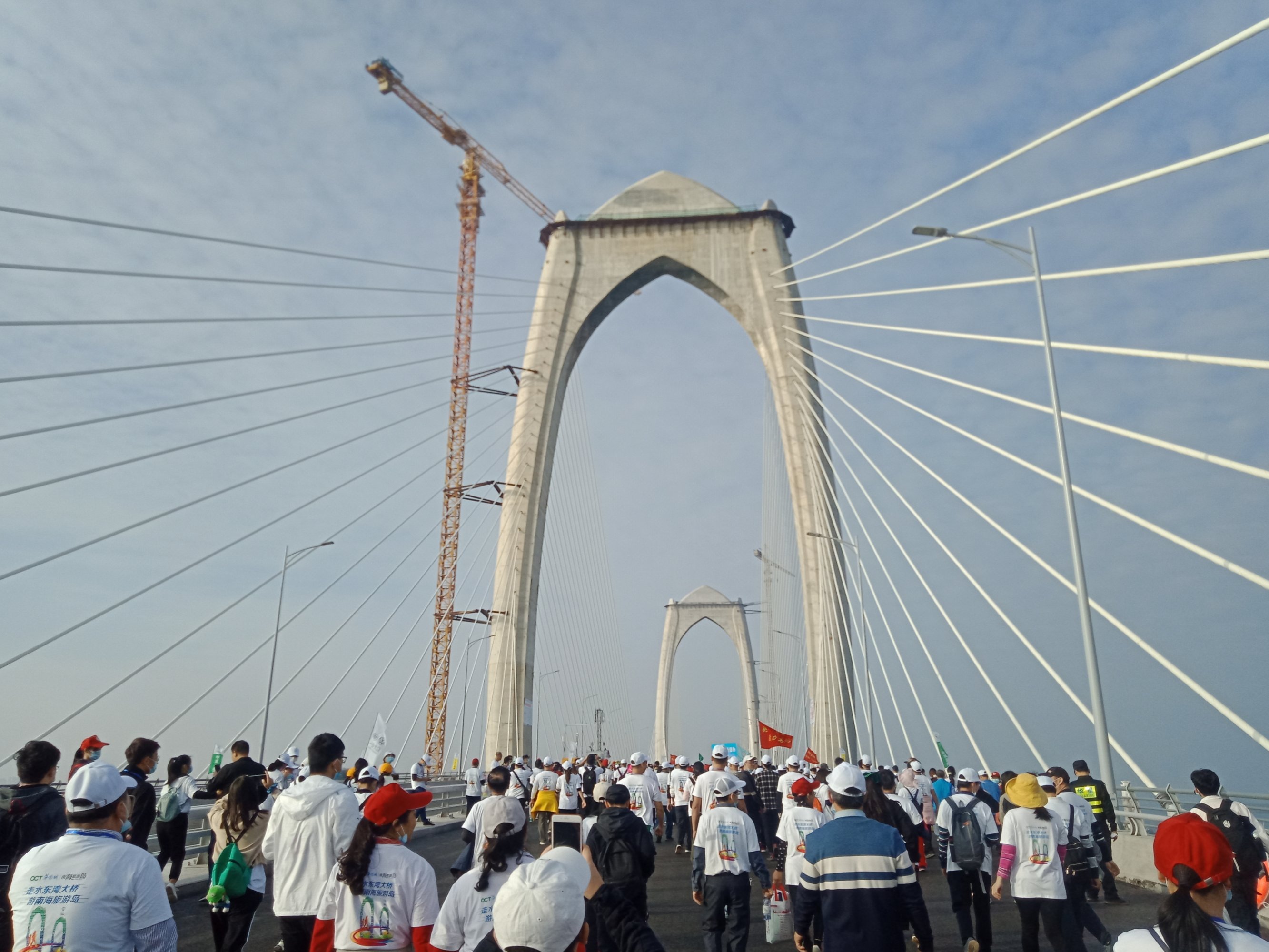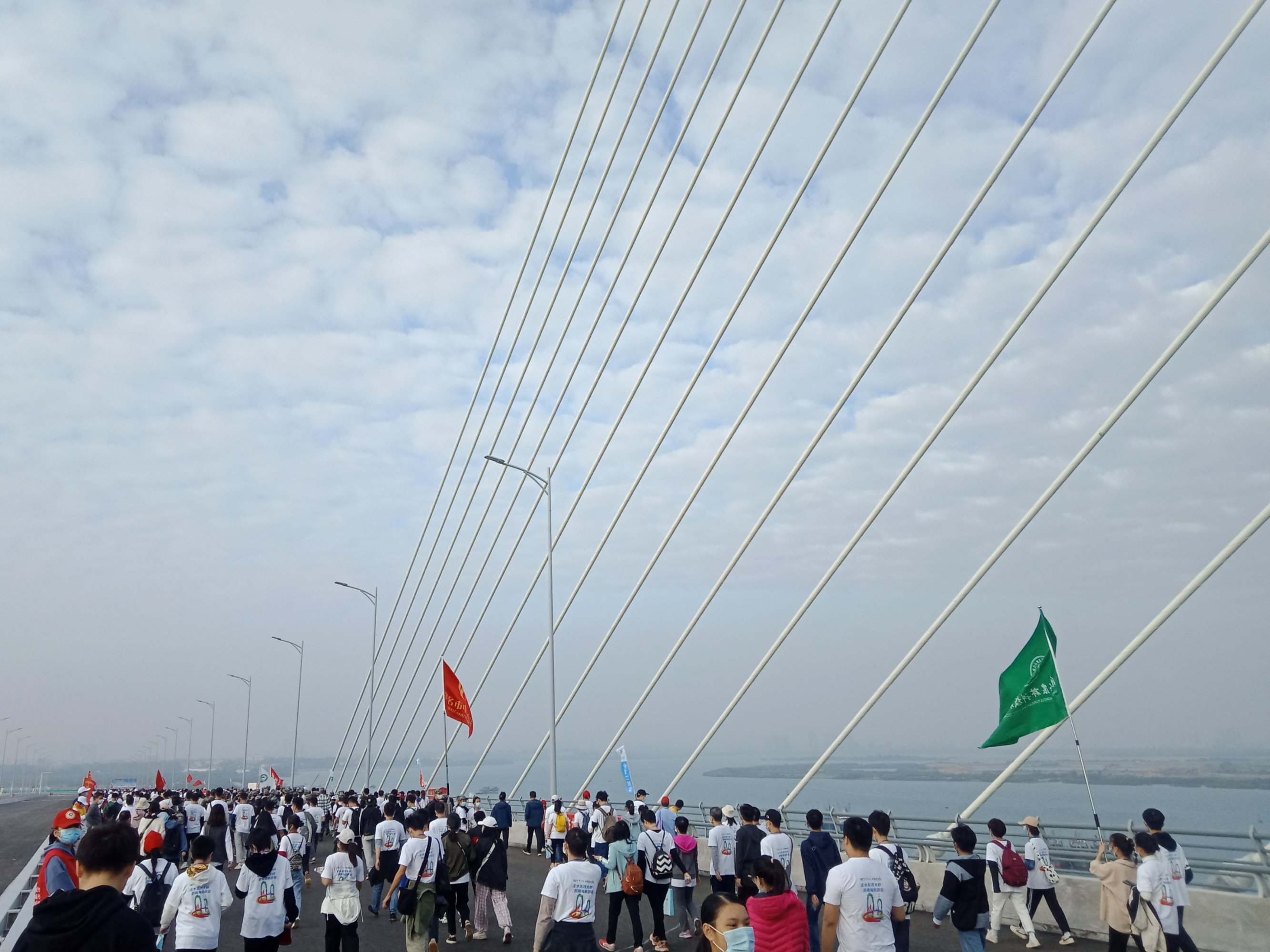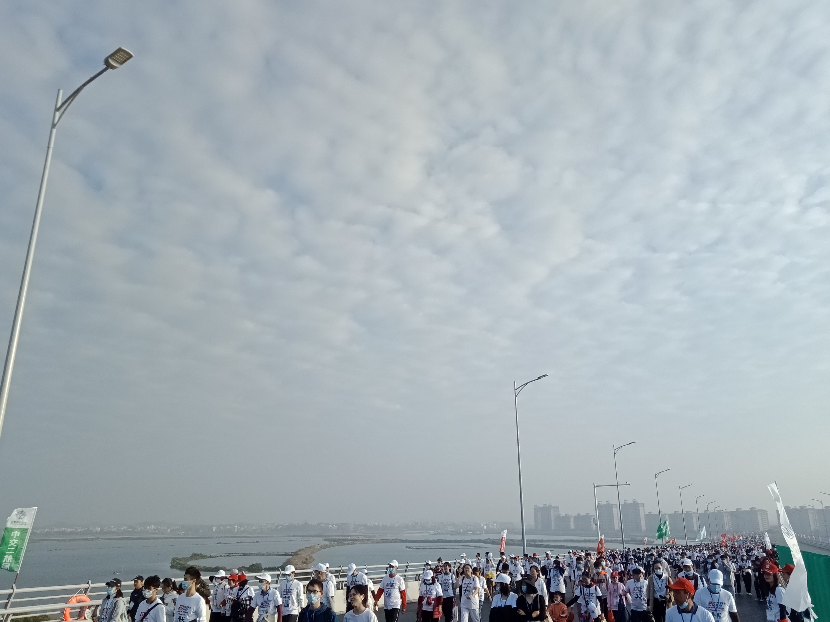 我早上将近七点钟就到了,我想看下有多少人参与,与看下人景,特别水东湾大桥上的人景,从起点一直走到可看见水东湾大桥上坡的位置,一眼望去已都是人影,而那个启动仪式好像是8点十几分才开始?为了一睹已占先偷步的水东湾大桥上的人景,我也没有看启动仪式,经过那启动仪式平台时,只看到还在演练