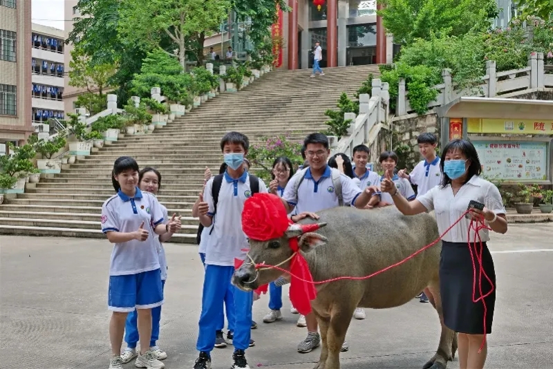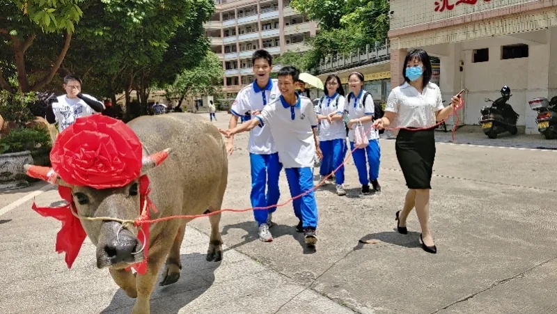 高考放榜后,广东茂名高州的一头小牛头顶大红花,走进了高州市第一中学,成了当地的“网红”。6月26日,南都记者了解到,这头小牛实际上是该校学生江英进的母亲送给学校的。江英进是今年的高考生,取得了物理类654分的成绩。母亲吕女士为了表达对学校的感谢,特意送来小牛,“祝孩子们都牛气冲天,考第一。”