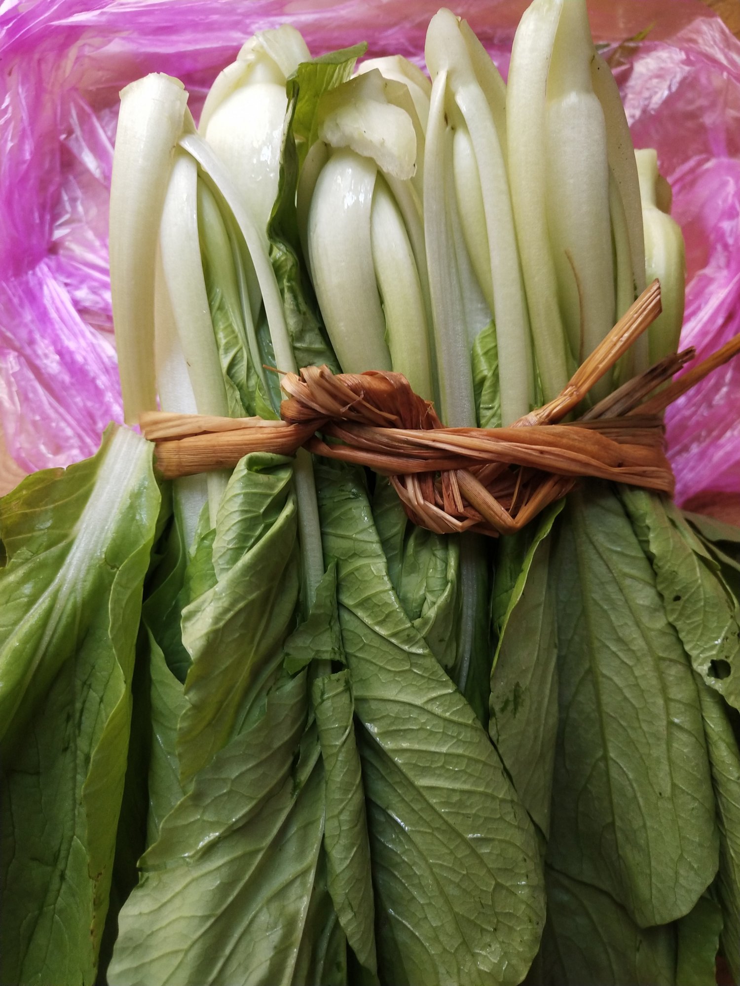 我看到你这个图片,我都不想说你。 你觉得这根稻草很长吗? 你把稻草拆开来仔细看一下再说话。。 你认真看一下稻草的尾部,是不是用刀剁短了很多? 我再问你一个问题,你家里种过水稻吗?你知道水稻是怎么长的吗? 你留意看你这根稻草是不是剥了几层皮了? 是不是比稻草原样细了很多?(我意思是说菜农已经把这根稻草剥细了很多了。) 这样的稻草,你还觉得粗吗? 然后你把这扎菜拆开来。 把两根稻草分开来,你试一下只用一根稻草来扎,然后你再仔细对比一下,一根稻草扎起来和两根稻草扎起来有什么区别? 别说区别是一根和两根的区别,你要把注意力留在菜的上面。。 只用一根稻草来扎起来,是不是更容易把菜茎扎烂?(而且扎不牢固整捆菜也容易散开。) 你以为白菜茎很硬吗? 把菜的茎扎烂了,你还会买吗? 我建议你以后别吃本地白菜了。