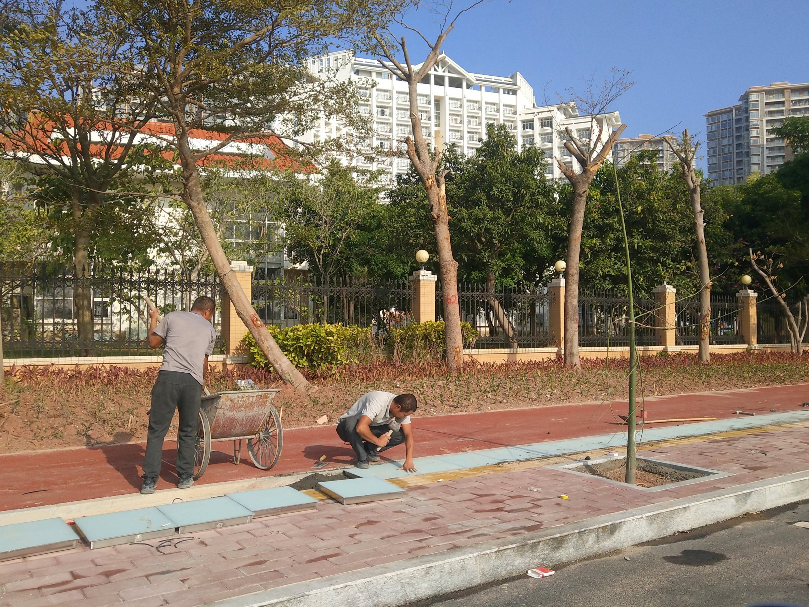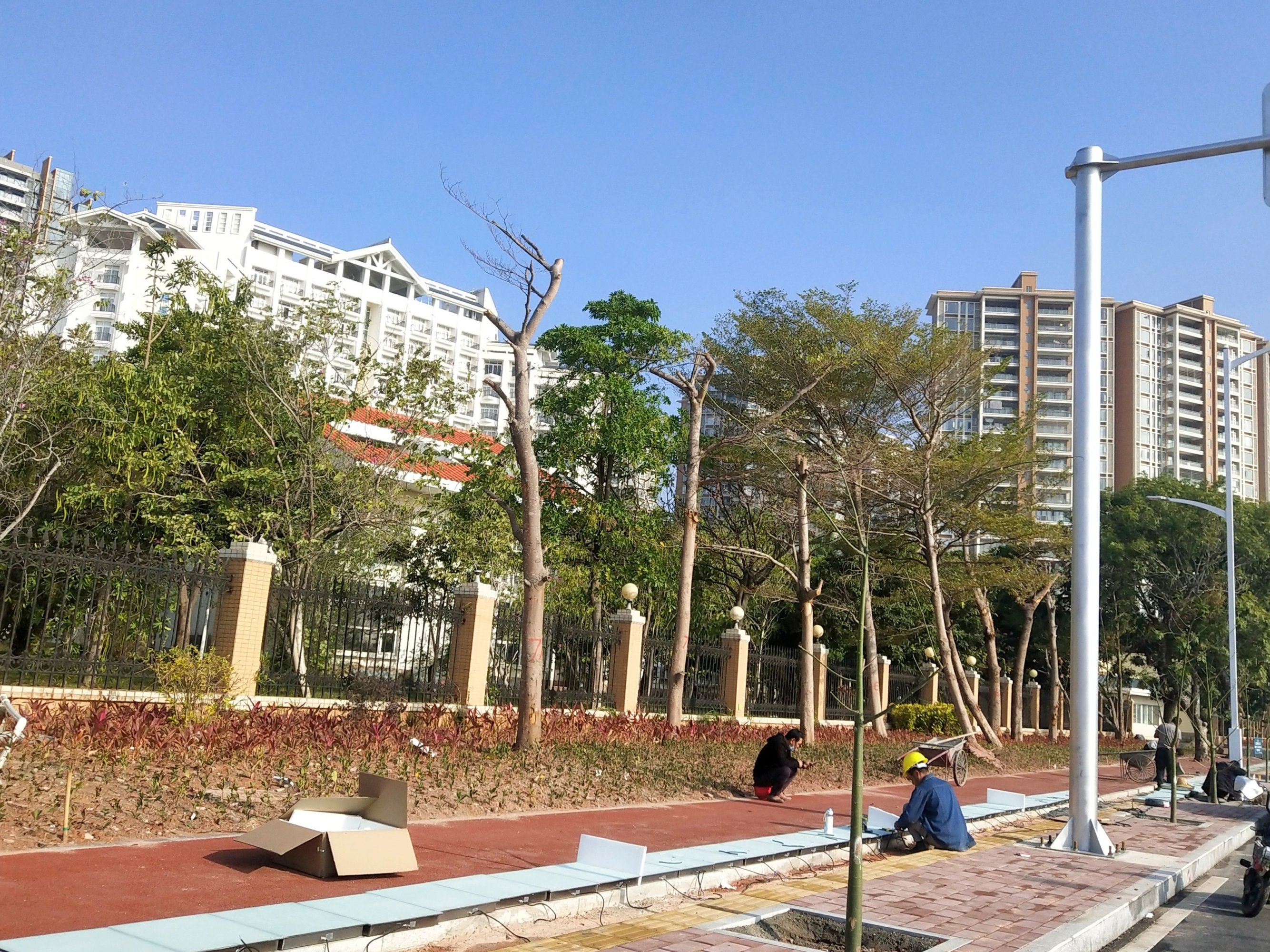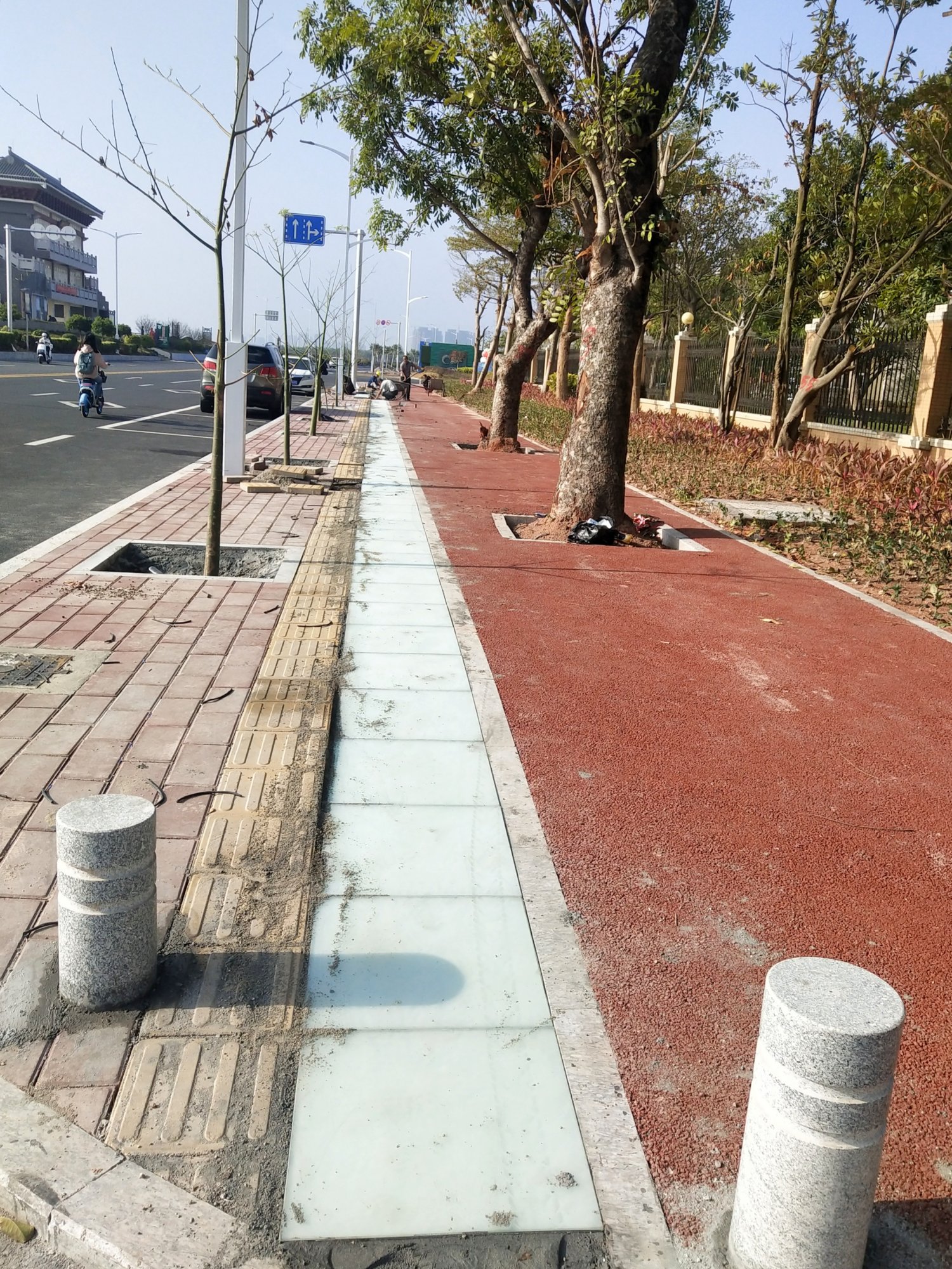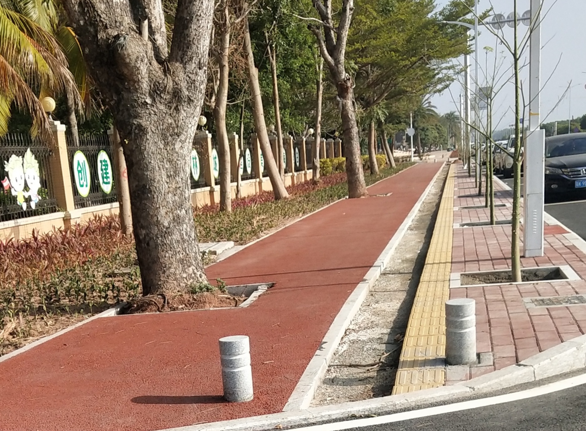 人行道不应该铺红绿的,应该像市区的人行道铺绿色,绿色看上去更加高档。