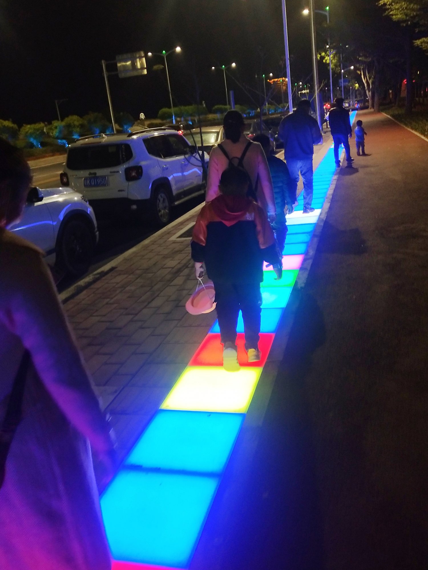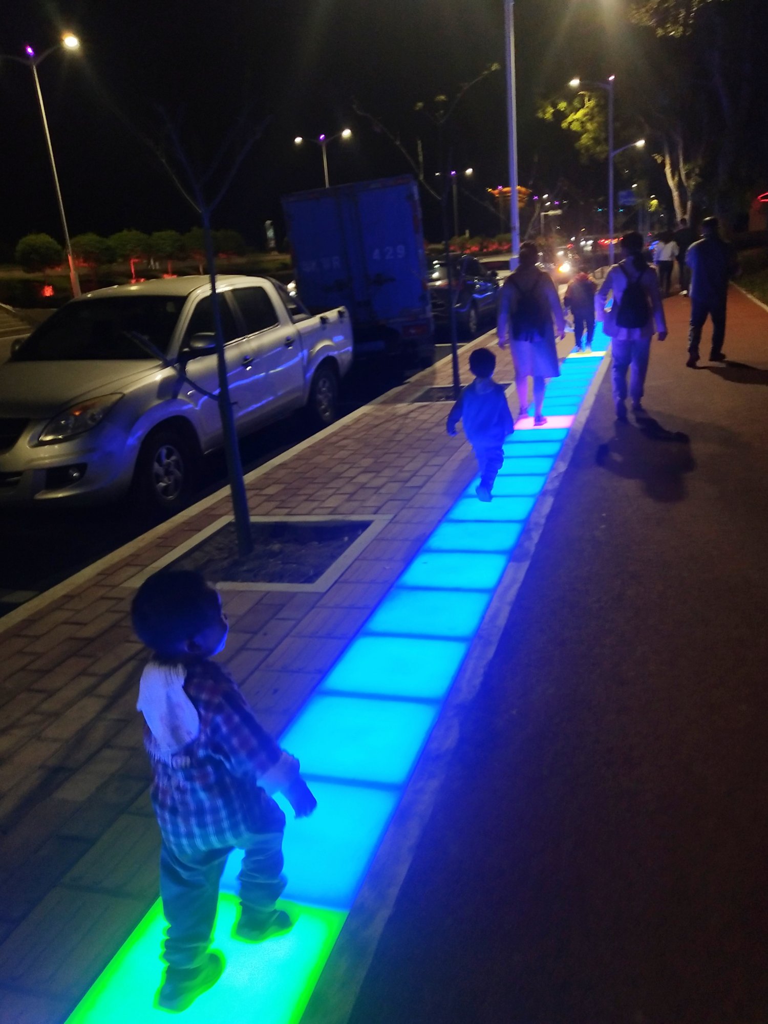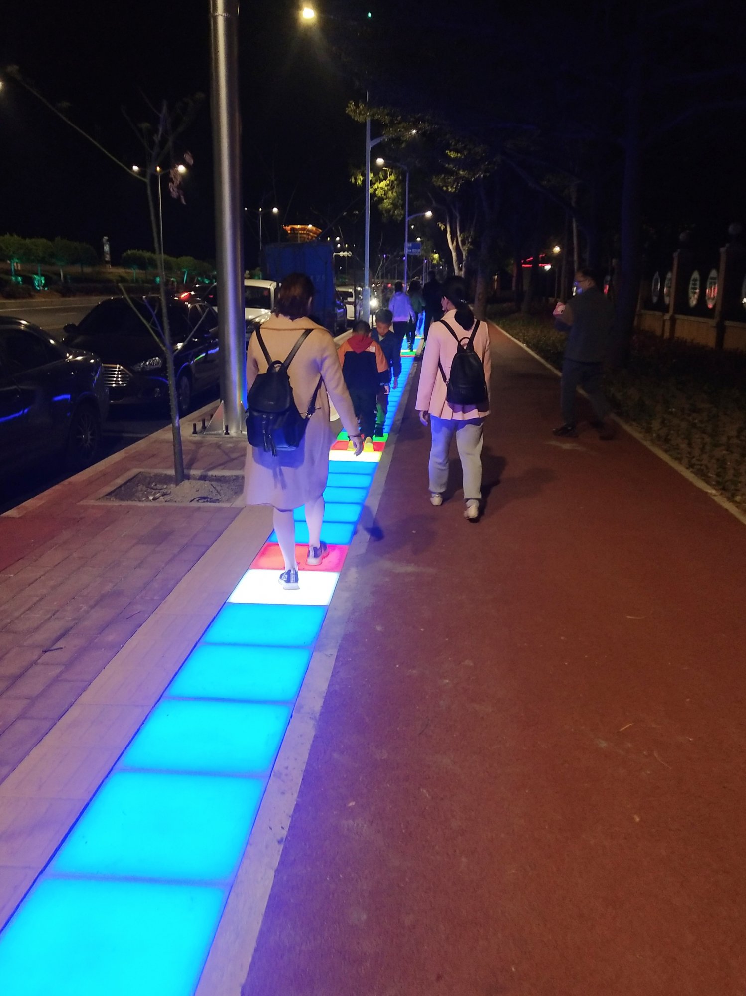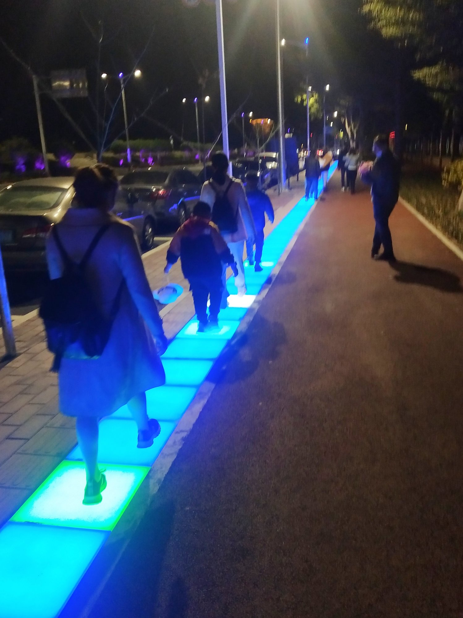 这样看好像是带电线,貌似如你所说那样大概是铺地面霓虹灯板,可能很快就被汽车压烂,因为电白汽车站都画人行道上的,烂了又有经费购买了,油水多多。