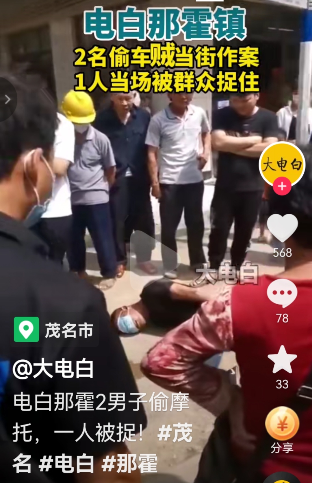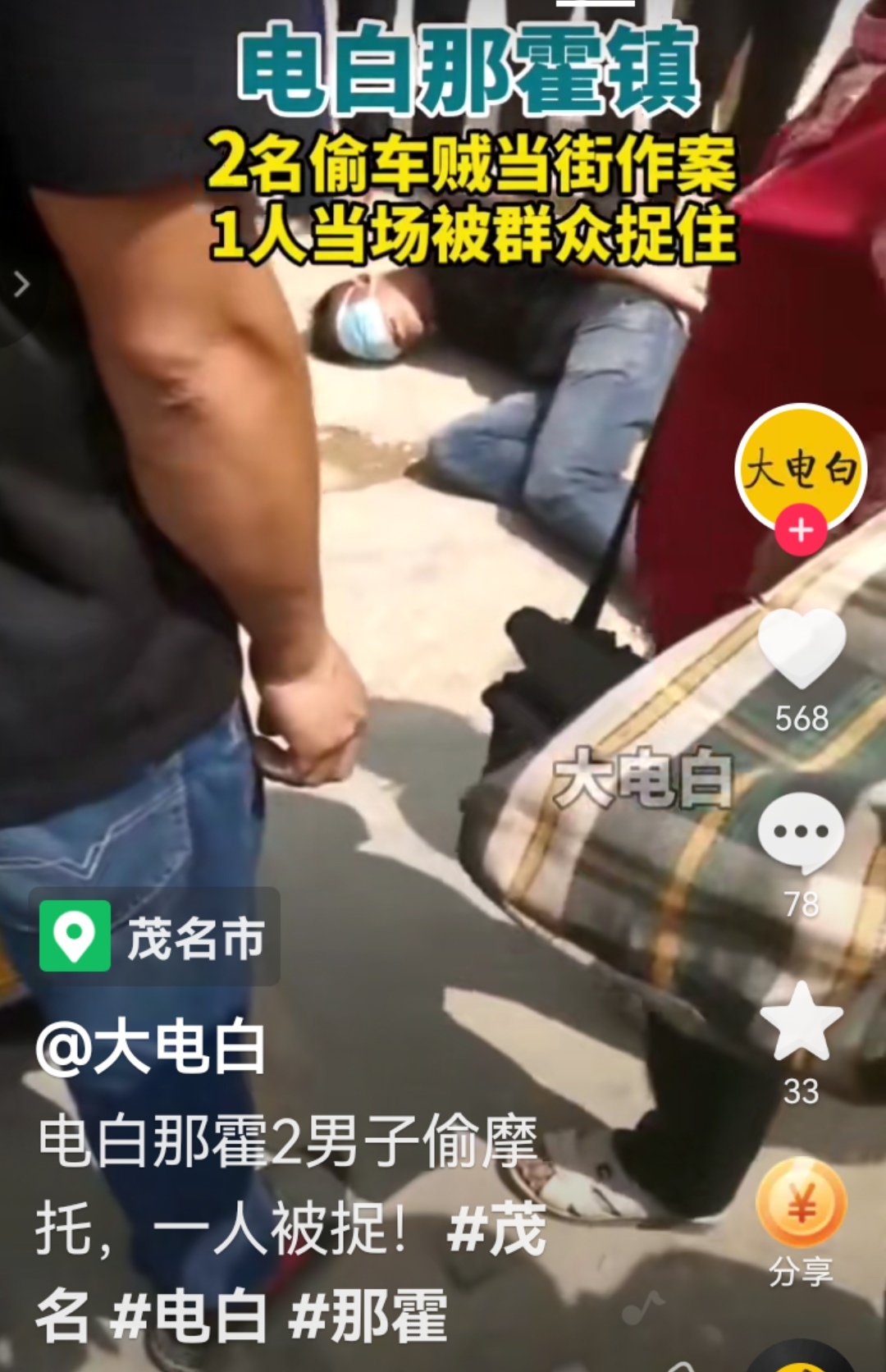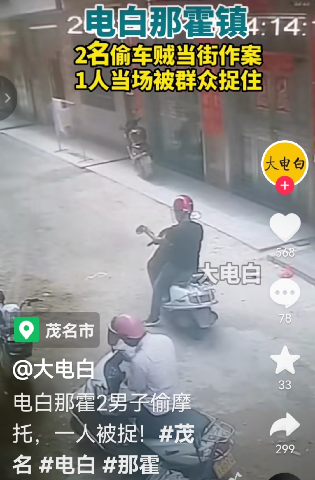 电白那霍镇,2名偷车贼当街作案,1人当场被群众捉住。