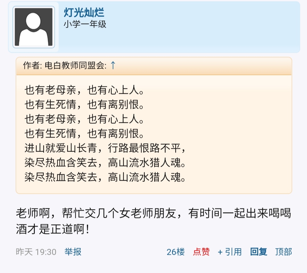 灯光灿烂 说: 你试试不撤掉,撤掉了桥归桥、路归路,本来是我惹起的,撤掉就完了,还真的是看清了您无论灵魂的纯洁还是智商的正常都不如屎忽,更别比其他的老师了,告诉你我本来非常尊重文化人的,不信你可以加我微信,多少你仰望不到的文化人为我题字赠画,你千万不要当教师了,误人子弟真的是无限大的罪过!!!!!!!! 点击展开... 一个心术不正的家伙,你有资格加我微信吗?不觉得寒碜?还提字给你,他们真是瞎了眼!别给自己抹光