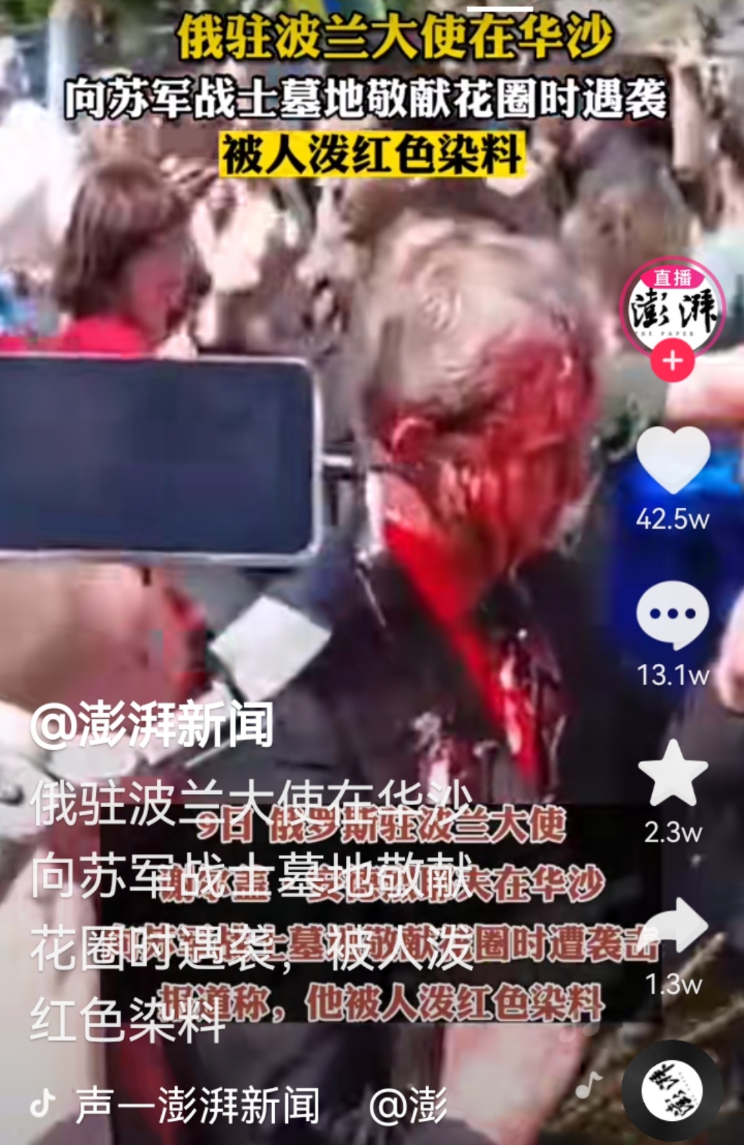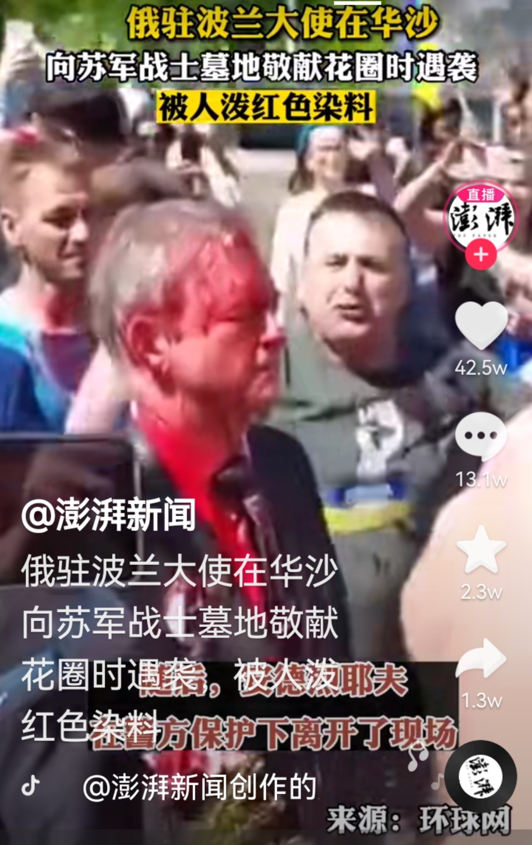 俄驻波兰大使在参加胜利日活动时被泼红漆。