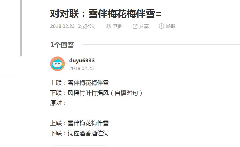 最佳答案:出句:雪映梅花梅映雪 对句:风羞月影月羞风