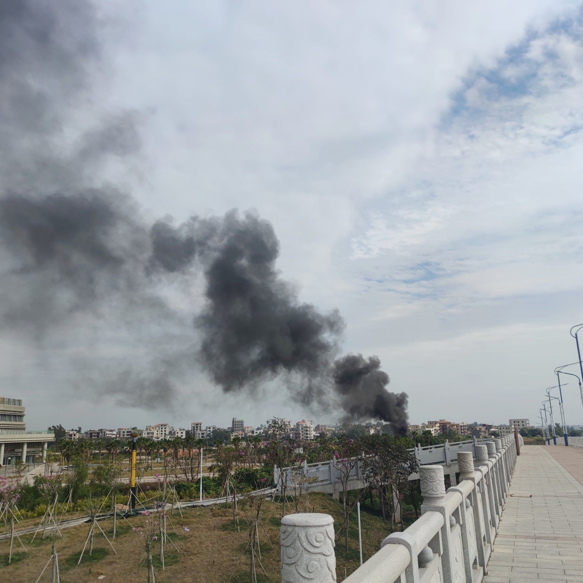 放好电摩走上海滨大桥,看着浓烟滚滚,我也不太敢靠得太近,不知是何原因着的烟火…?也就在我走靠近桥中间的时候,远远就听见有几辆消防车鸣笛快速赶过来…
