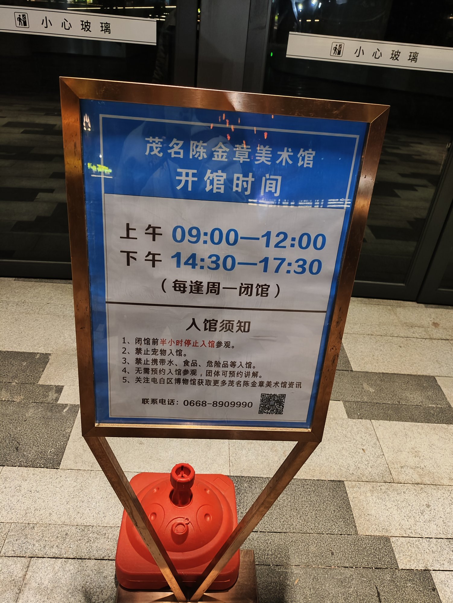 茂名陈金章美术馆 开馆时间 上午 09:00-12:00下午14:30-17:30 (每逢周一闭馆) 一天竟然只开放5个半小时,5点半就关门了 真是笑死人了,晚上大家饭后想去逛逛都不行 这种小地方,就算有场馆,软件方面也是差的离谱 那些sb工作人员不想上班可以不上啊 这上班时间简直是荒唐