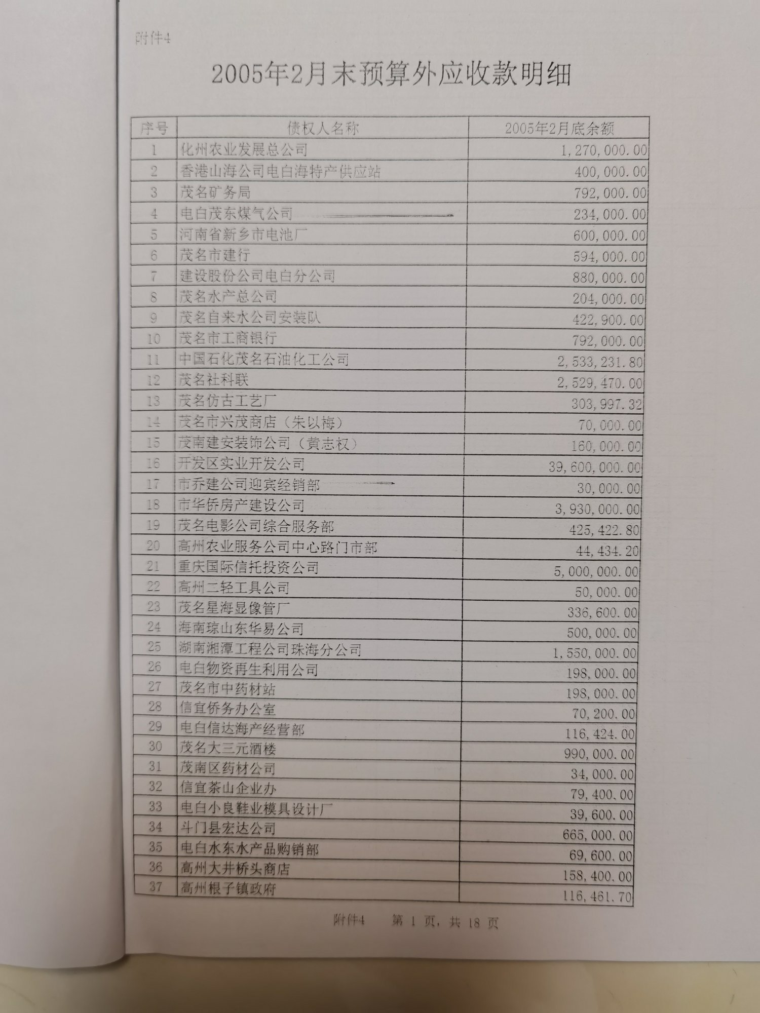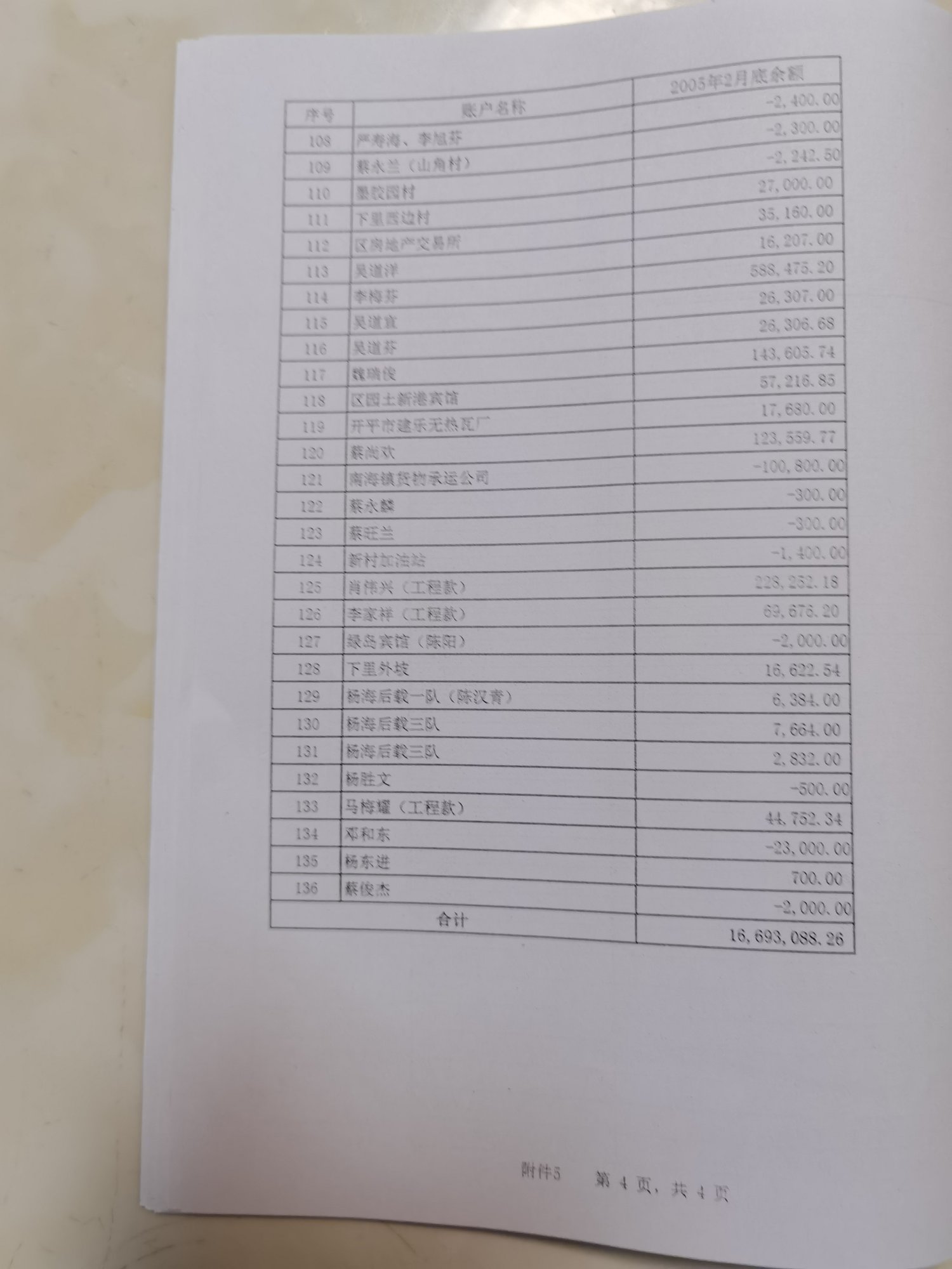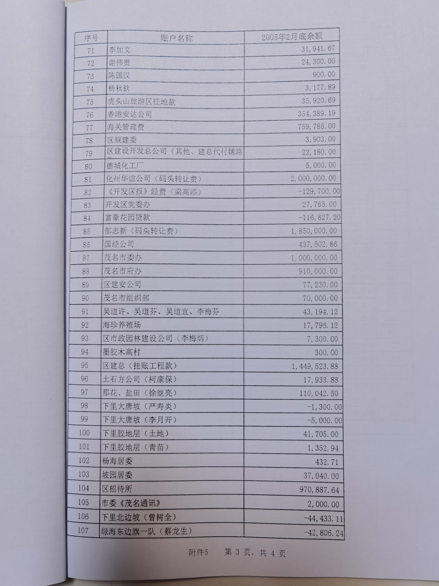 (2)2005年2月末"预算外应付款"总账科目余额为17051715.63元,明细账余额合计为16693088.26元,明细账余额合计比总账科目余额少358627.37元。(附件5:2005年2月末预算外应付款明细表)