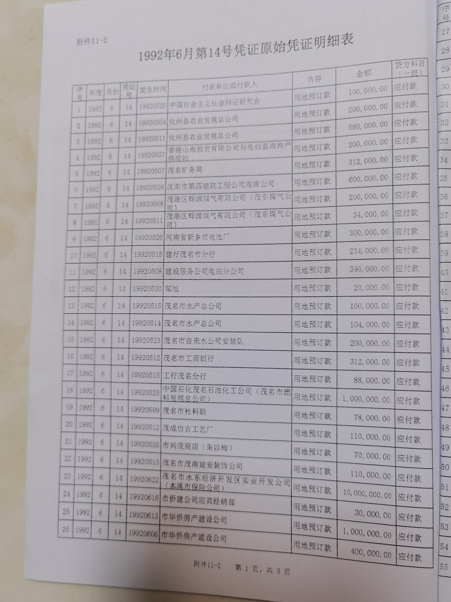 (1)1992年6月第14号凭证,记账凭证中"应付款"科目登记预收土地款123笔,金额45100294元;但在附件中有财会人员备注的101号共135张收款收据,金额合计只有43461390元,比记账凭证金额少1638904元。(附件11-1:1992年6月第14号凭证一预收地皮定金123笔;附件11-2:1992年6月第14号凭证原始凭证明细表)