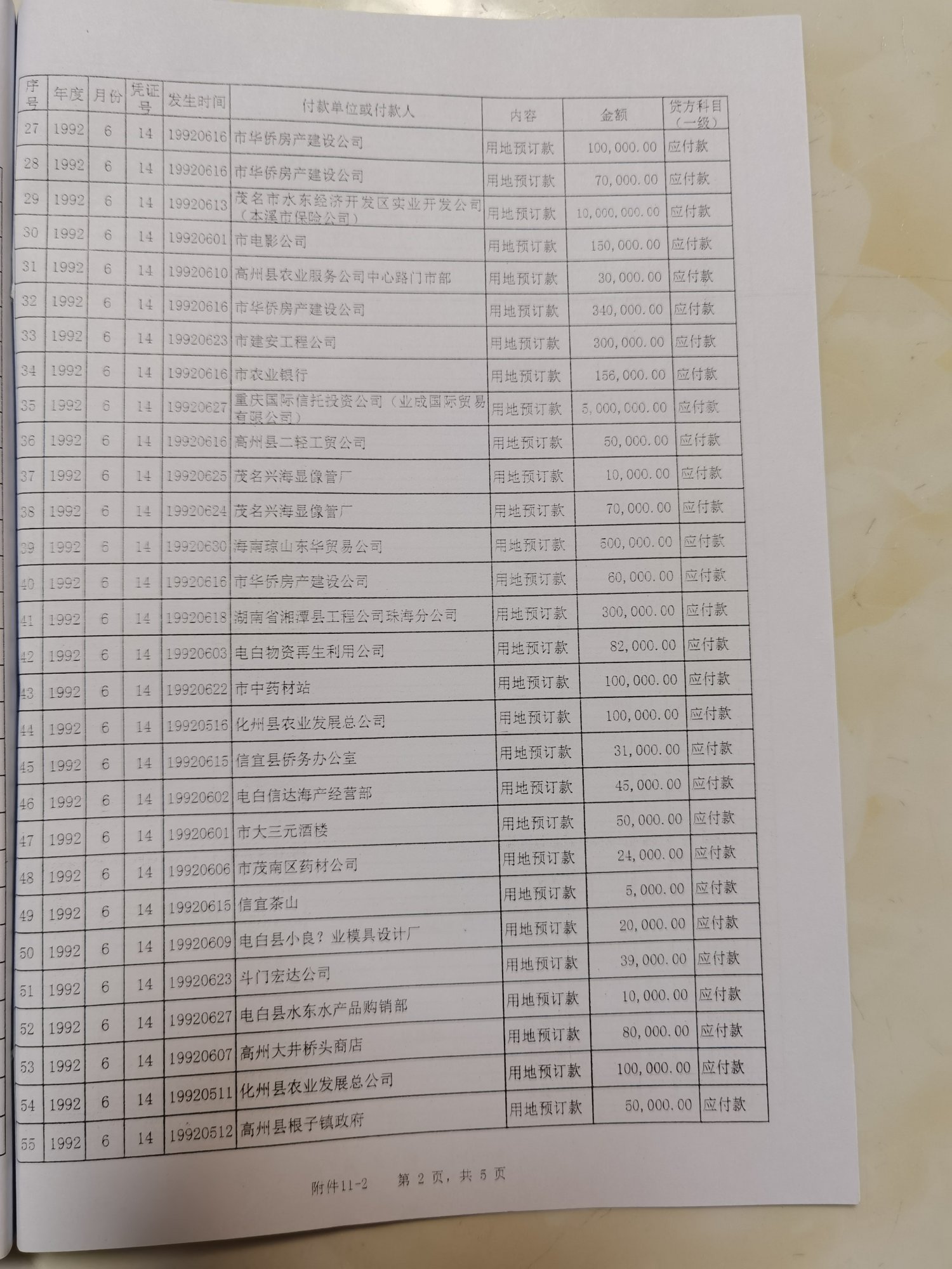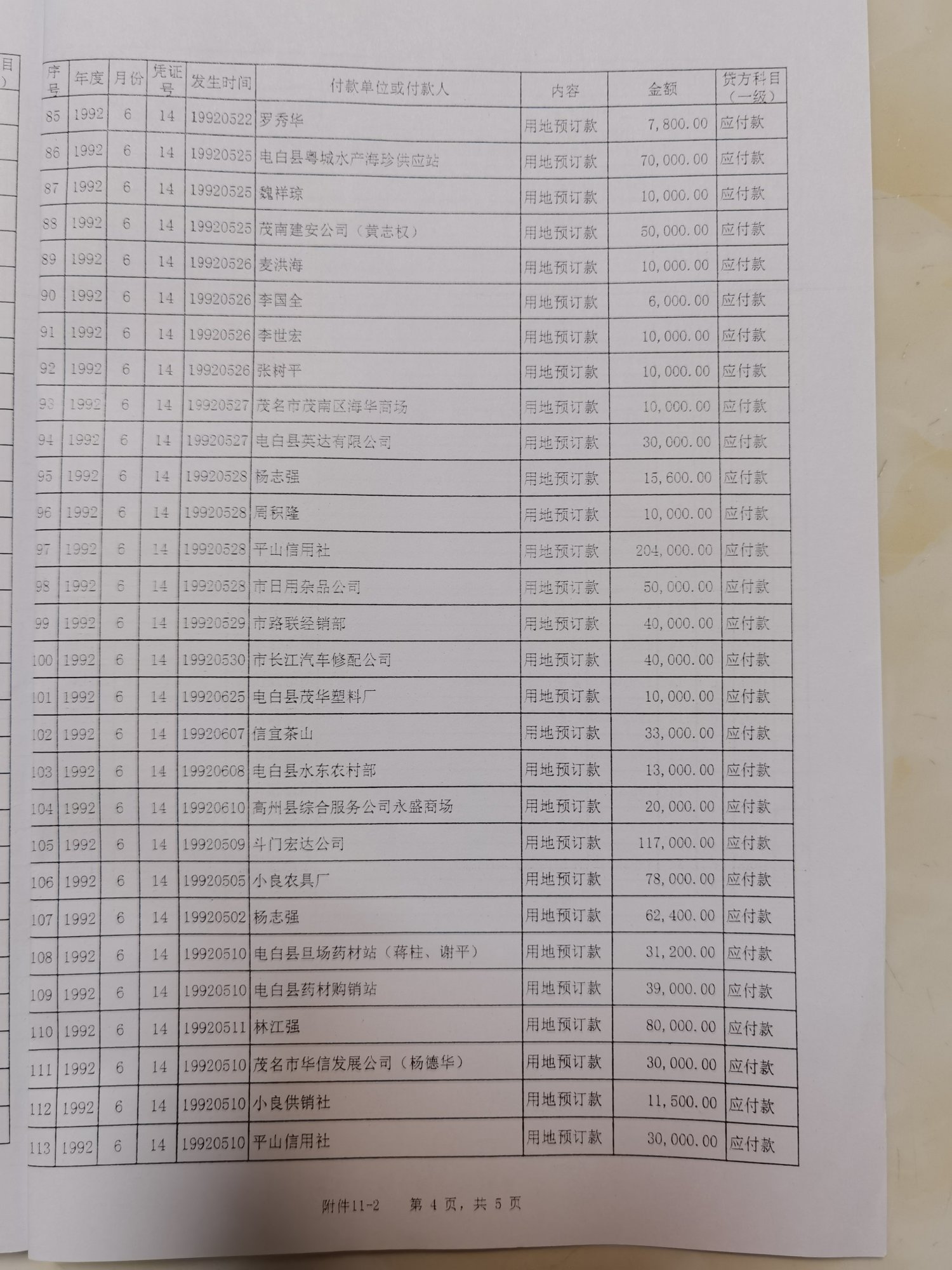 (2)1992年7月第22号凭证中,记账凭证"应付款"科目登记预收土地款13笔,金额4552200元;但在附件中只找到8张收款收据,金额合计3378000元,比记账凭证金额少1174200元。(附件12-1:1992年7月第22号凭证一预收地皮定金13笔;附件12-2:1992年7月第22号凭证原始凭证明细表)