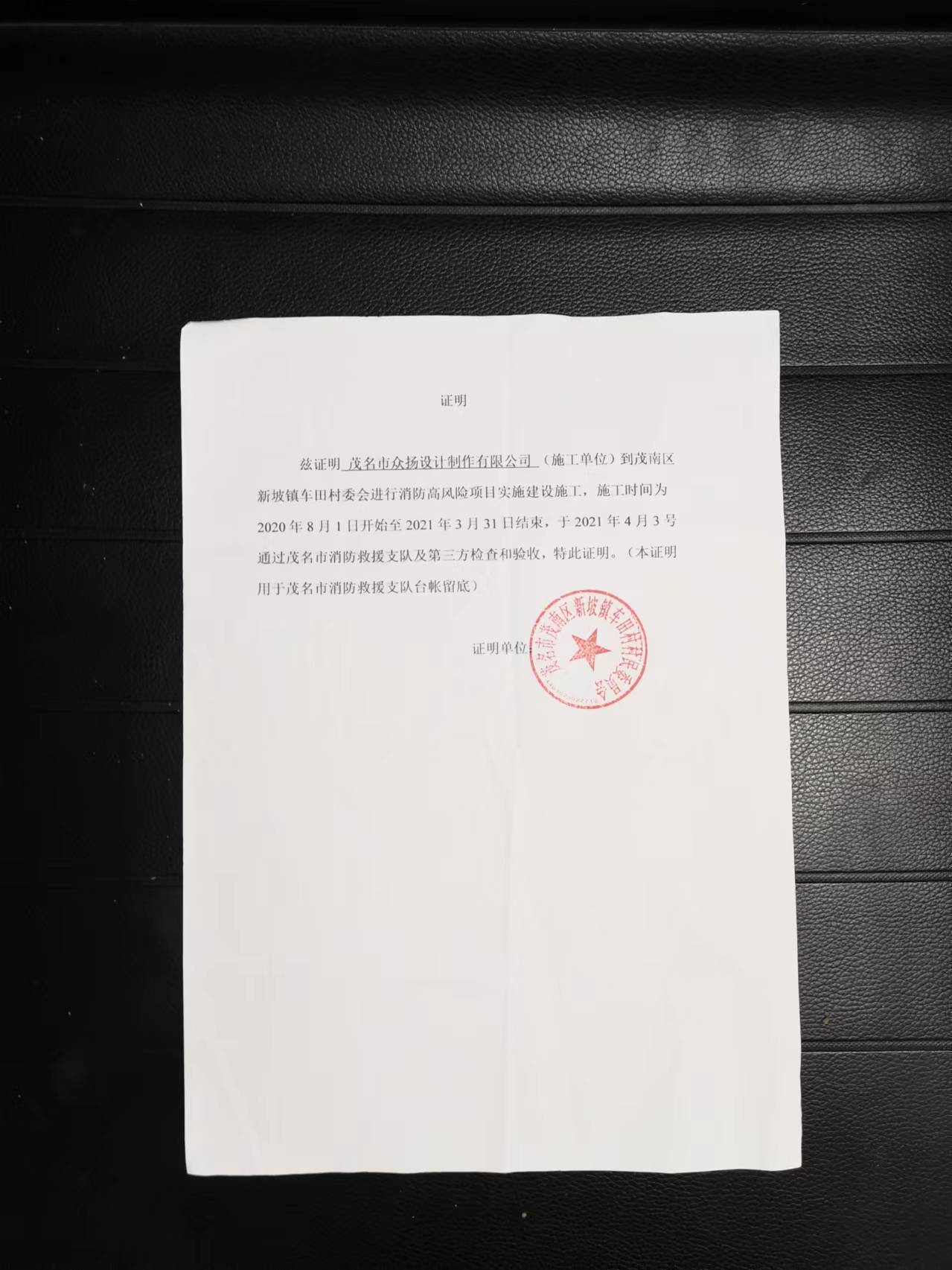 事情发生在2020年4月,茂南区新坡镇车田村被列为茂名市第十二批火灾高风险区域挂牌督办单位。为了全面消除火灾隐患,给人民群众创造良好的消防安全环境,陈新华、黎永旭、杨木稳、范灵利、唐品坦、林建洪等10位工人日夜加班加点,高质量完成该项工程,并获得评比总分95.6分,当年位居茂名市第二名。