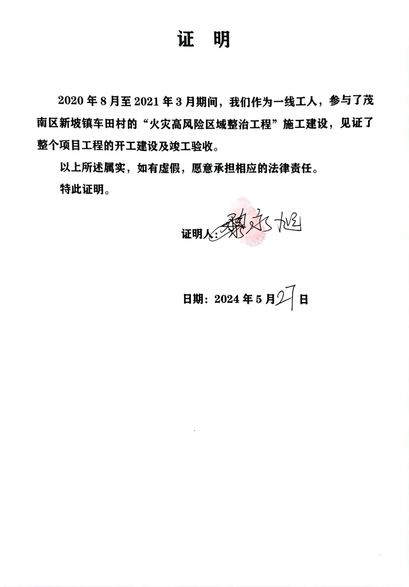 对于此次火灾高风险区域整治工程,车田村委会出具的书面证明,证实了该工程由茂名市众扬设计制作有限公司陈先生等人施工建设。工程竣工不久后,杨敏镇委书记完全否认此事,他说按合同办事,言下之意当时双方没签合同,且事后也不补签,巳至于郑勇患病因无钱医治而去逝。30万元的工程款就等于打水漂了,十位工人耗时8个月的汗水就是白流了,岂不是挖一个巨大的火坑让群众往里面跳吗?