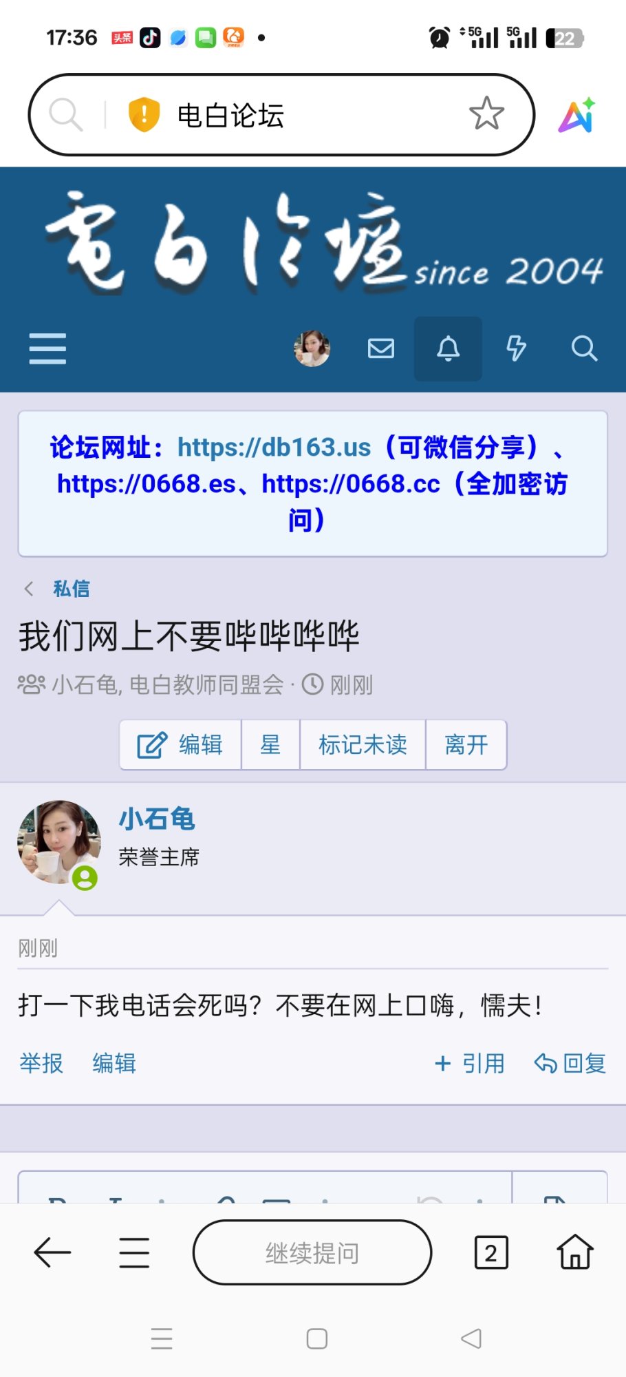 小石龟 荣誉主席 注册 2020-09-30 消息 8,319 反馈评分 323 点数 191 年龄 50 性别 男 2025-09-24 Android Chrome Mobile 115.0.5790.168 #91 电白教师同盟会 说: 你妈逼,打废你这条狗不费吹灰之力,知道不? 浏览附件373136 点击展开... 附件 Screenshot_2025-09-24-17-36-04-07_439a3fec0400f8974d35eed09a31f914.jpg 166.5 KB · 查看: 200