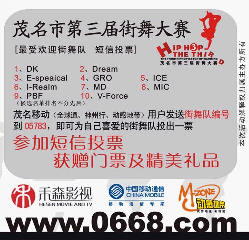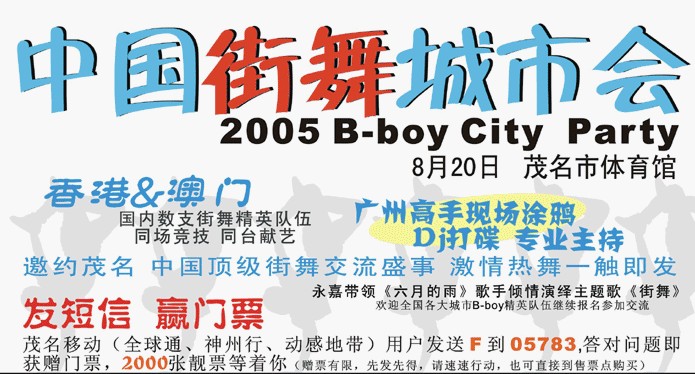 P PBF咩仔 研究生 注册 2004-10-27 消息 1,059 反馈评分 0 点数 61 2005-08-11 #1 茂名市第三届街舞大赛 8月20日 下午2:30 茂名市体育馆 中国街舞城市会 8月20日 晚上 7:30 茂名市体育馆 . 普通票:5元/场 贵宾票:10元(一票看两场并坐贵宾座) 售票地点:茂名市体育中心正门 酷龙服饰 领先数码科技 大赛热线:0668--2870668 附件 01...jpg 99.1 KB · 查看: 294 03...jpg 79.9 KB · 查看: 267 02.jpg 46.2 KB · 查看: 293