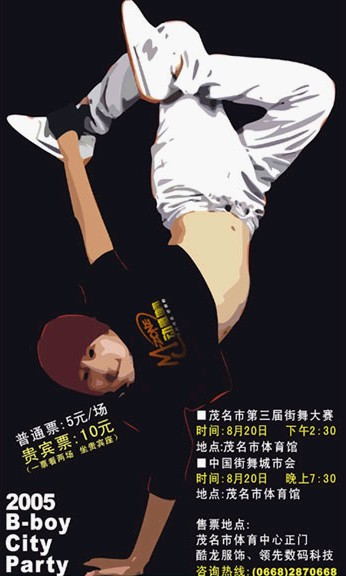 茂名市第三届街舞大赛 8月20日 下午2:30 茂名市体育馆 中国街舞城市会 8月20日 晚上 7:30 茂名市体育馆 . 普通票:5元/场 贵宾票:10元(一票看两场并坐贵宾座) 售票地点:茂名市体育中心正门 酷龙服饰 领先数码科技 大赛热线:0668--2870668