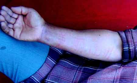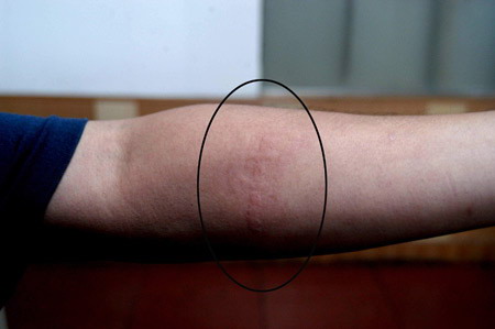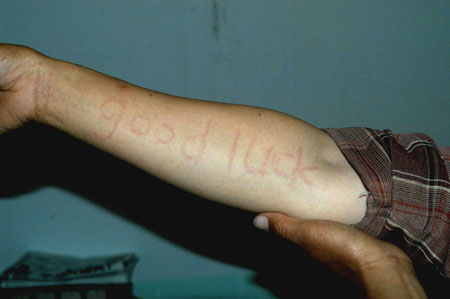 经医生初步检查,胡某没有疾病,皮肤健康,身上没有任何字迹和印痕。随后,专家就胡某的病史情况进行了检查和询问,包括最初出字的时间、字迹消退时间长短、病变反应症状以及有无家庭病史等内容。针对专家的询问,胡某一一作了详尽的回答。之后,为了证实胡某是否患有常见的人工划痕症,专家用指甲在她的皮肤上划了一个字,皮肤上出现了轻微的痕迹,专家解释胡某可能患有皮肤划痕症(略呈阳性)。