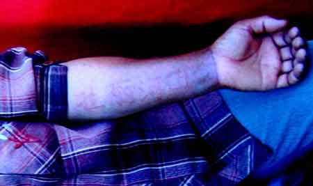 省皮肤性病学会常委、省人民医院专家门诊中心皮肤科主任王国玉,在隔离检查现场查证完胡某身上的字迹后,倍感惊异的说:“这种现象闻所未闻,真的是太奇特,让人感到不可思议。”王主任就胡某身上出现的字痕分析说,假如是人工划痕所留,用手磨压字迹不会消失,划下的字在肉皮表层有肉痕,一般30分钟左右便自然消失。而胡某胳膊上所出来的英文字迹,若用手轻轻磨压就会消失,起手后又清晰地出现,其呈现的血色印痕久久不消退,时间长达9个多小时,而且用水擦洗会更加清晰。从出字的症状看,胡某皮肤“长”出的字处在皮肤表层的浅层毛血细管,它不属于身体疾病,只是一种皮肤层的变异现象,很奇妙,具有很好的研究价值。王主任希望此事能引起社会和有关部门的关注,然后组织专门的医学力量对其进行探索及专题研究,争取早日破解留在胡某身上的这个不解之谜。文/图 本报记者 鲁进峰 裴强