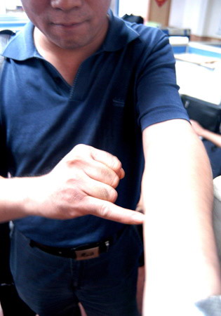 王先生在胳膊上划出地“甲”字。