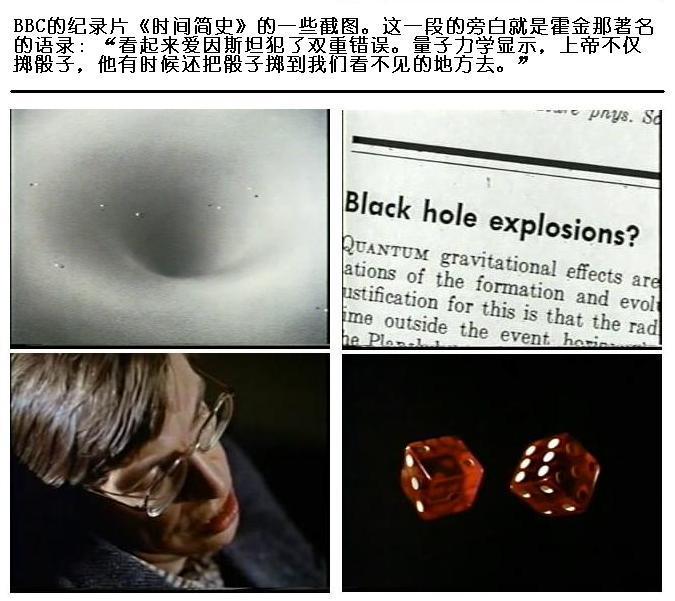 当物质落入黑洞的时候,它所包含的信息被完全吞噬了。因为按照定义,没什么能再从黑洞中逃出来,所以这些信息其实是永久地丧失了。这样一来,我们的决定论再一次遭到毁灭性的打击:现在,即使是预测概率的薛定谔波函数本身,我们都无法确定地预测!因为宇宙波函数需要掌握所有物质的信息,而这些信息却不断地被黑洞所吞没。霍金对此说了一句同样有名的话:“上帝不但掷骰子,他还把骰子掷到我们看不见的地方去!”这个看不见的地方就是黑洞奇点。不过由于蒸发过程的发现,黑洞是否在蒸发后又把这些信息重新“吐”出来呢?在这点上人们依旧争论不休,它关系到我们的宇宙和骰子之间那深刻的内在关系。