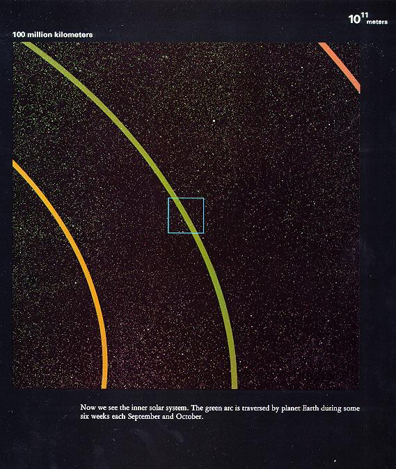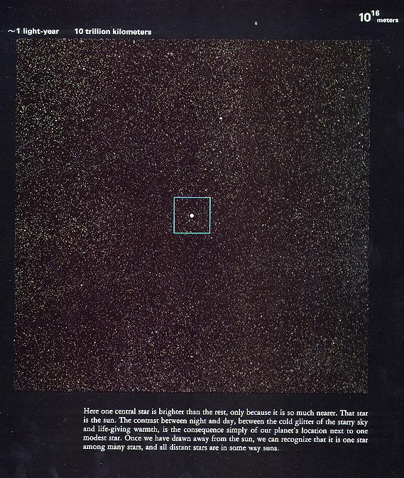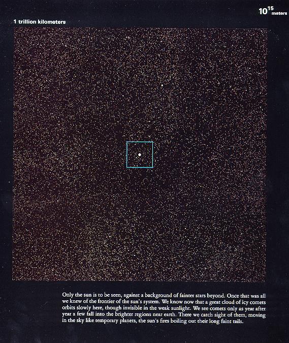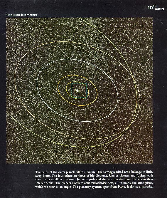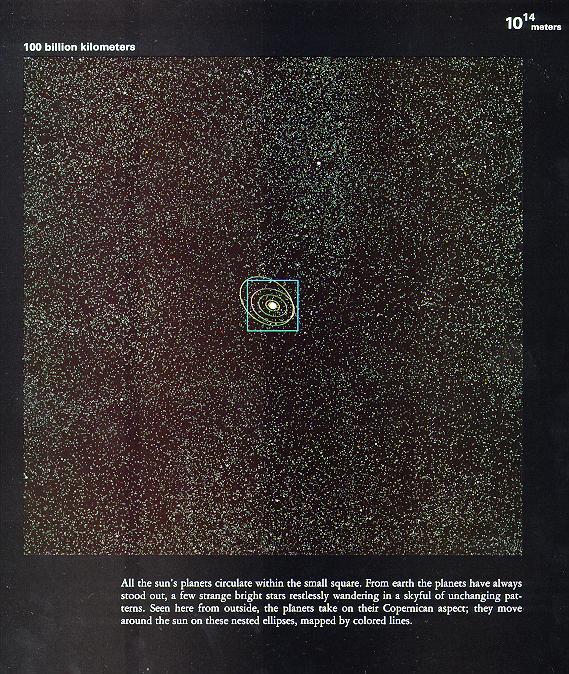 放大十倍来观察以繁星为背景的太阳系。说是繁星,其实与太阳最近的恒星――半人马座比邻星都是在4.22光年开外的。图中的亮点仅仅只是背景上离得八丈远的星星呢,并不是太阳系的一部分。