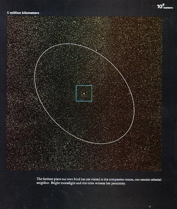 在10万光年这样的数量级下,我们就看见了整个的银河系。事实上,银河系的直径就是十万光年。真有哪位能发明个跟光速一边快的飞船,从银河系的这边飞到对面来个大吊角,就要十万年的时间!我靠,在这样漫长的旅程来看,人生不过朝生暮死,蜉蝣一般。但这只是对相对于银河系静止的观测者而言,船上的人员感受到的旅程其实只有数分钟。相对论呀,深了去了。