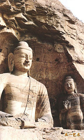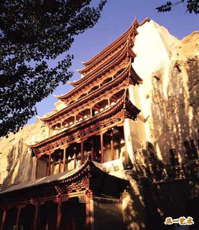 俗称千佛洞。位于甘肃敦煌市东南25公里的鸣沙山东麓崖壁上,上下五层, 南北长约1600米。始凿于366年,后经十六国至元十几个朝代的开凿, 形成一座内容丰富、规模宏大的石窟群。现存洞窟492个,壁画45000平方米,彩塑2400余身, 飞天4000余身, 唐宋木结构建筑5座,莲花柱石和铺地花砖数千块, 是一处由建筑、绘画、雕塑组成的博大精深的综合艺术殿堂, 是世界上现存规模最宏大、保存最完好的佛教艺术宝库, 被誉为“东方艺术明珠”。本世纪初又发现了藏经洞(莫高窟第17洞),洞内藏有从4─10世纪的写经、文书和文物五、六万件。 引起国内外学者极大的注意, 形成了著名的敦煌学。