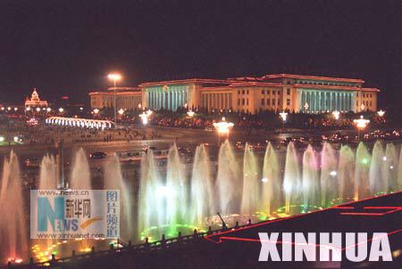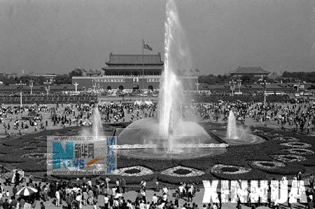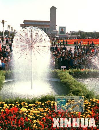1986年10月4日,天安门广场中央设置的蒲公英状的喷水池,引得游人流连忘返。