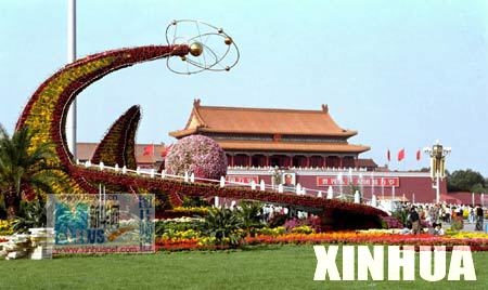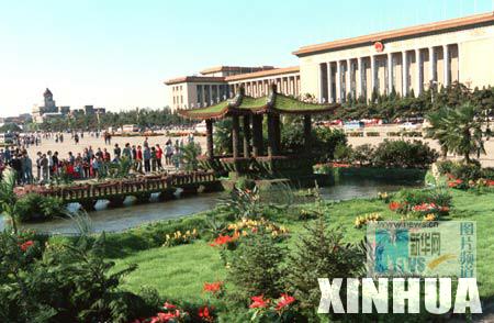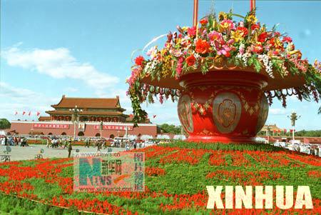 1991年9月30日,国庆节前夕,16万盆鲜花将北京天安门广场装点一新。
