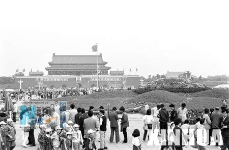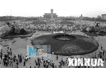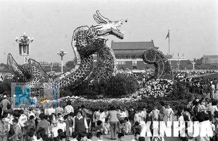 1986年国庆来临之际,北京用十万盆鲜花组成各式花坛装点天安门广场,