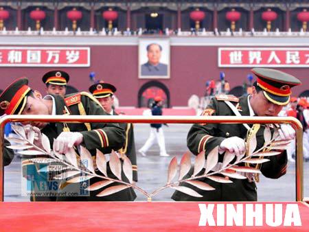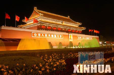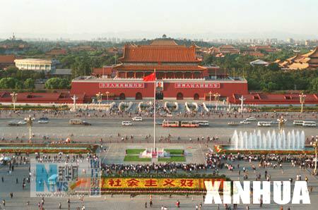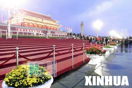 北京天安门广场被装扮得五彩缤纷,鲜艳夺目。