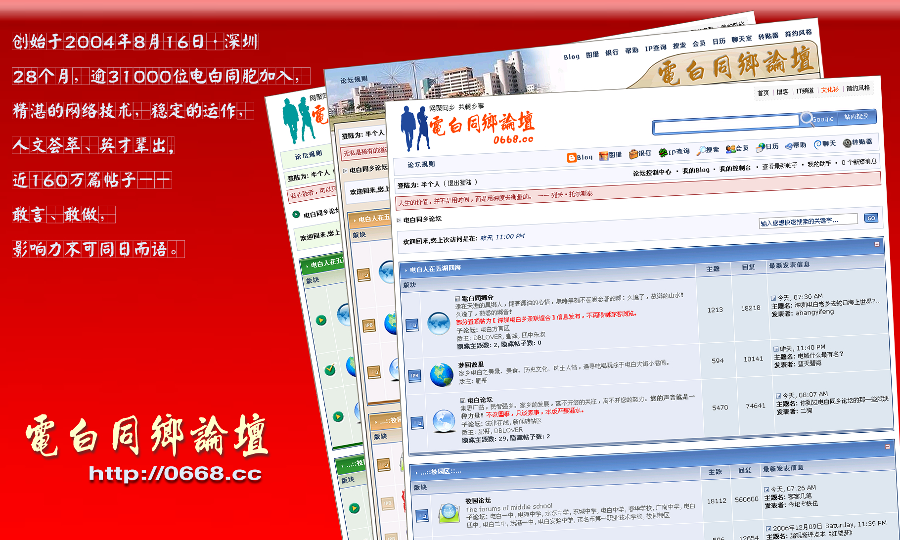 只要是电白的网站或论坛,敝人都支持!不会偏爱或偏见那一方。或许他们的立场与取向不同,也因此各有长短之处。想了解民间声音及发言时就上同乡论坛,想知道多点同乡信息资料时就上同乡联谊网,并没矛盾,只是优势互补。都是电白人,最好不要潜意识里搞什么对立。