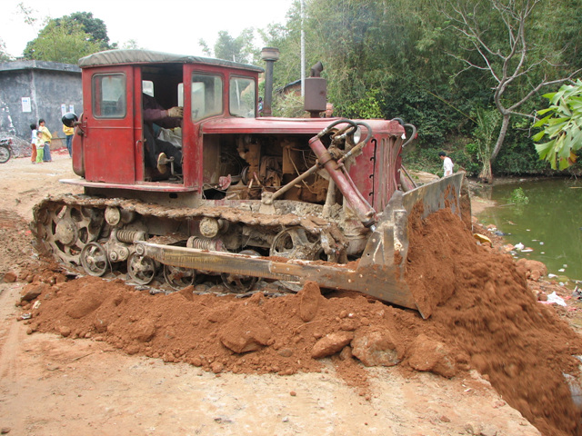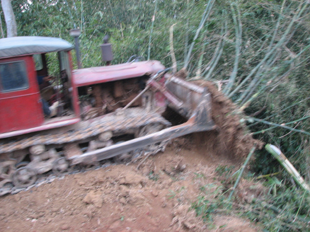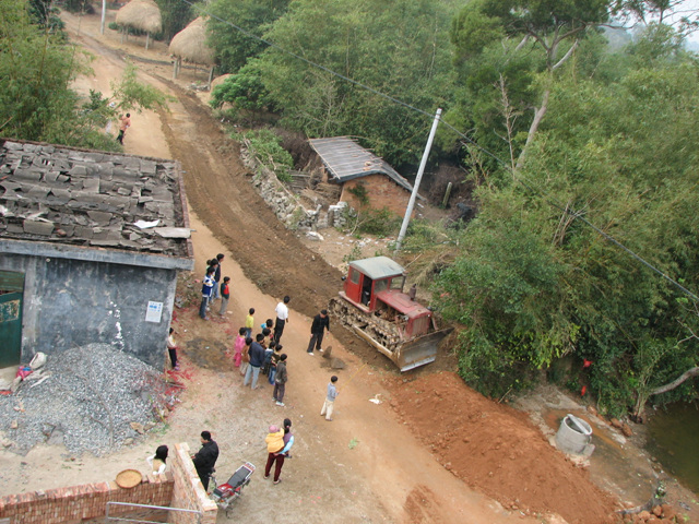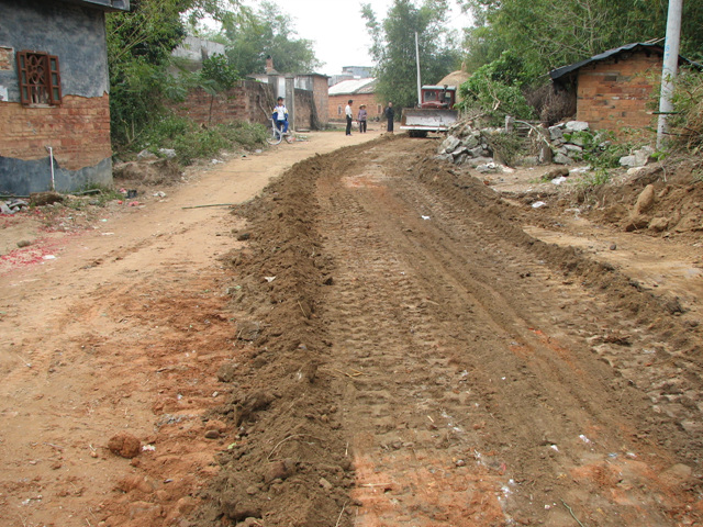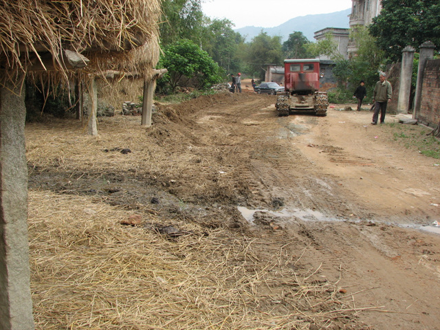 自掏腰包花钱请推土机来推直村里的道路,公私兼顾,为使道路拉直。