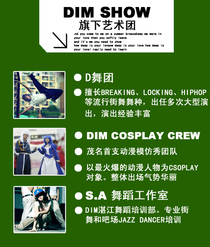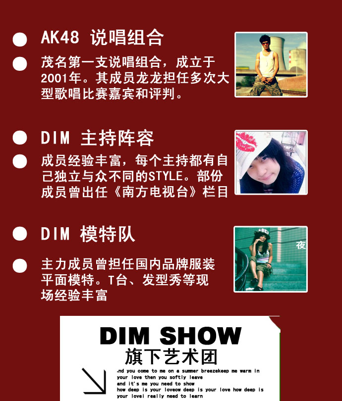 DIM,成立于2006年8月。一个品牌文化传播机构的打造与开始!创新的理念和超前的策划思想成就了今天在茂名娱乐界的稳固根基!新的一年,DIM更完善的策划推广和专业的商演团队将会给你带给更大的宣传收益!DIM欢迎广大商家来电合作!让我们的策划和节目给你的推广带上飞翔的翅膀!