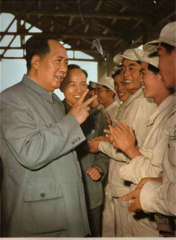 毛主席在安徽视察工厂时,同炼钢工人亲切谈话。(一九五九年)