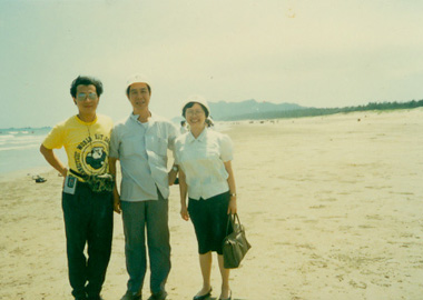 上图左是他86年首次返乡在虎头山照的照片,下图左是90年在茂名搞的活动后与郑达在虎头山的照片,下图右是他上文提到过的与李再唐(现香港电台台长,电白同乡)的合照。