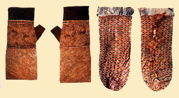 汉代妇女服饰实物 沙马王堆一号汉墓出土的实物中,服装的款式是典型的西域民族样式,但质料和纹样有汉族特点,还织着富有吉祥如意的汉字,是东汉时期各民族人民相互交融的产物。马王堆汉墓发掘出的实物资料异常丰富,尤其是服装,经历二千多年,质地仍然坚固,色泽依然鲜艳,反映出古代劳动人民的精湛技术和高超水平。从一号墓出土的服饰有素纱禅衣、素绢丝绵袍、朱罗纱绵袍、绣花丝绵袍、黄地素缘绣花袍、{绢裙、素绢裙、素绢袜、丝履、丝巾、绢手套等几十种之多。颜色有茶色、{红、灰、朱、黄棕、棕、浅黄、青、绿、白等。花纹的制作技术有织、绣、绘。纹样有各种动物、云纹、卷草及几何纹等。其中最使人感到惊奇的是这种素纱禅衣,整件服装,薄如蝉翼,轻如烟雾,衣长128厘米,两袖通长190厘米,在领边和袖边还镶着5.6厘米宽的夹层绢缘,但全部重量只有48克,还不到一两,是一件极为罕见的稀世之品。本图为“信期绣”绢手套(湖南长沙马王堆一号汉墓出土实物)及菱纹“阳”字锦袜(新疆民丰东汉墓出土实物)。