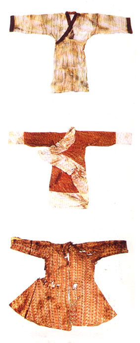 秦汉妇女服饰实物 上图素纱禅衣(湖南长沙马王堆一号汉墓出土实物)。中图印花敷彩{红纱曲裾绵袍(湖南长沙马王堆一号汉墓出土实物),身长130公分,两袖通长236公分。右图地“万事如意”锦女服(新疆民丰东汉墓出土实物),身长133公分,两袖通长189公分。服装的款式是典型的西域民族样式,但质料和纹样有汉族特点,还织着富有吉祥如意的汉字,是东汉时期各民族人民相互交融的产物。马王堆汉墓发掘出的实物资料异常丰富,尤其是服装,经历二千多年,质地仍然坚固,色泽依然鲜艳,反映出古代劳动人民的精湛技术和高超水平。从一号墓出土的服饰有素纱禅衣、素绢丝绵袍、朱罗纱绵袍、绣花丝绵袍、黄地素缘绣花袍、{绢裙、素绢裙、素绢袜、丝履、丝巾、绢手套等几十种之多。颜色有茶色、{红、灰、朱、黄棕、棕、浅黄、青、绿、白等。花纹的制作技术有织、绣、绘。纹样有各种动物、云纹、卷草及几何纹等。其中最使人感到惊奇的是这种素纱禅衣,整件服装,薄如蝉翼,轻如烟雾,衣长128厘米,两袖通长190厘米,在领边和袖边还镶着5.6厘米宽的夹层绢缘,但全部重量只有48克,还不到一两,是一件极为罕见的稀世之品。