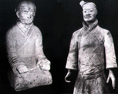 秦汉男女服饰 左图穿窄袖袍服的秦代妇女(陕西临潼近郊出土陶俑)。右图穿窄袖袍服的秦代男子(陕西临潼出土陶俑)。从这两件陶俑的服饰来看,秦代男女日常生活中的服饰形制差别不大,都是大襟窄袖,不同之处是男子的腰间系有革带,带端装有带钩;而妇女腰间只以丝带系扎。