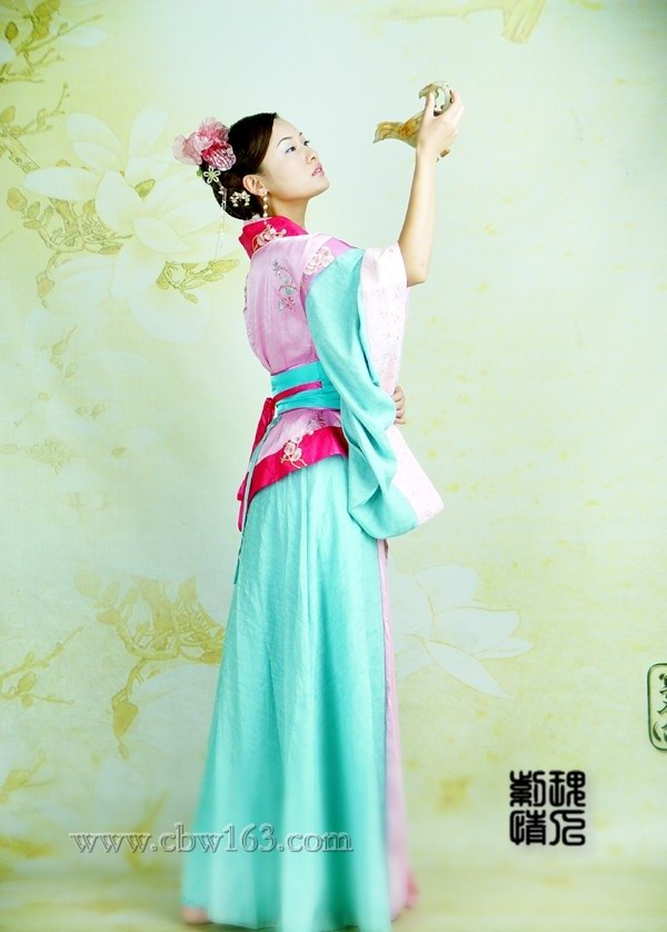 汉代妇女的襦裙 汉代妇女的襦裙图(参考甘肃武威磨咀子汉墓及湖南长沙马王堆汉墓出土实物复原绘制)。上襦下裙的女服样式,早在战国时代已经出现。到了汉代,由于深衣的普遍流行,穿这种服式的妇女逐渐减少。据此,有人认为汉代根本不存在这种服饰,只是到了魏晋南北朝时才重新兴起。其实,汉代妇女并没有摒弃这种服饰,在汉乐府诗中就有不少描写。这个时期的襦裙样式,一般上襦极短,只到腰间,而裙子很长,下垂至地。1957年在甘肃武威磨咀子汉墓中发现了襦裙实物,襦以浅蓝色绢为面,中纳丝棉,袖端接一段白色丝绢。裙子也纳有丝棉,质料用黄绢。可惜由于年代久远,这套服饰在出土时已经粉化。本图展示的襦裙样式,即根据该墓发掘时的形象记录复原绘制而成。采用的纹样,主要依据新疆民丰出土的“长乐明光锦”及长沙马王堆汉墓出土的“豹首纹锦等。襦裙是中国妇女服装中最主要的形式之一。自战国直至清代,前后二千多年,尽管长短宽窄时有变化,但基本形制始终保持着最初的样式。