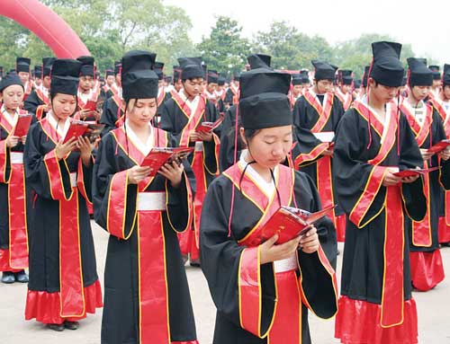 中国式学位服分为学士服、硕士服和博士服三类,每套学位服由学位冠(黑色弁)、学位缨、学位领(六种不同颜色交领右衽义领)、学位衣裳(深衣或玄端)、学位礼服徽、西式皮鞋等六部分组成,其中学位缨颜色区分学士、硕士、博士,分别为黑、深蓝、红色;学位领按文、理、工、农、医、军事六大类,采用粉、灰、黄、绿、白、红色六种颜色区分。