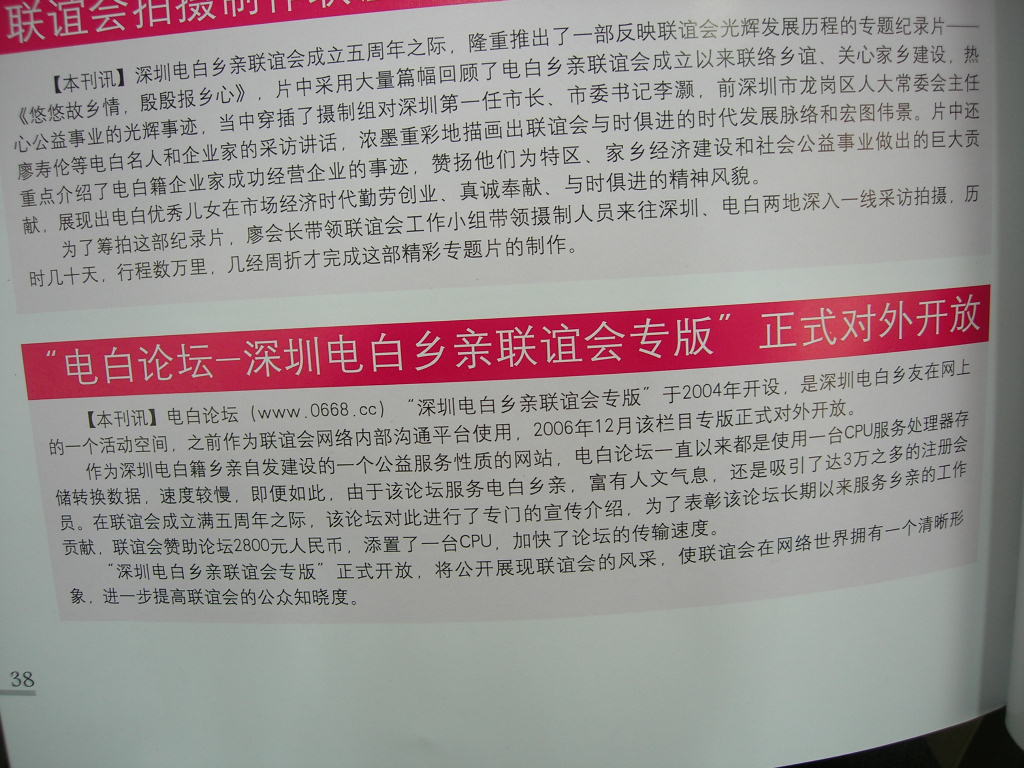最新的"深圳电白科技经济促进会"通讯录(2007.1编)共有113页,内容有点多,要上传有点困难.我征求乐叔的意见看看是否有妥善的方法.另外,在网络上公开那么多个人的通讯资料可能有点不好.如果在深圳的同乡想查阅通讯录的话可以找参加同乡会的老乡.我很乐意帮大家