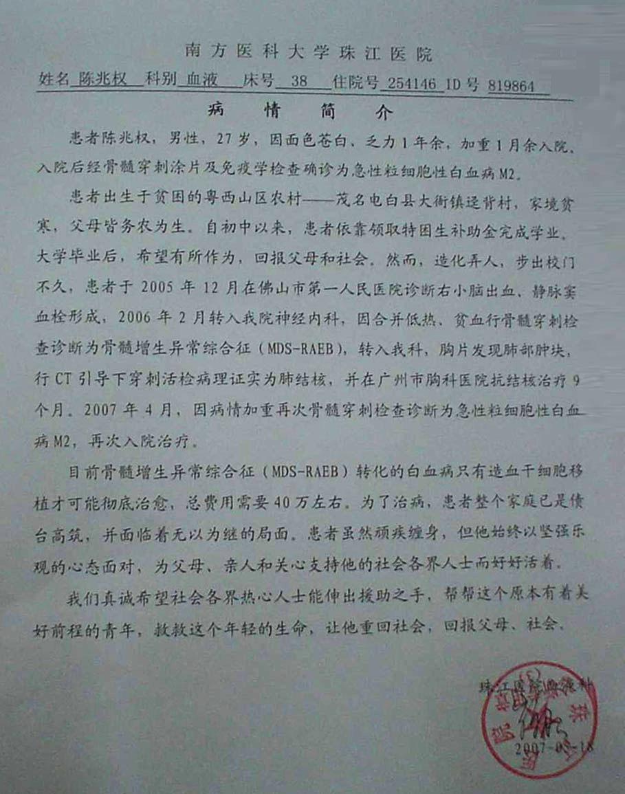 2004年大学毕业,但他没有找到如意的工作,只在一家私人公司做临工。到了2005年,他才找到一份满意的工作,在佛山高明某机关单位,然而“天有不测风云,人有旦夕祸福”,快到三个月末期工作要转正的时候,一场灾难性的疾病却悄悄的降临在他的头上,2005年12月因头痛,不适住入佛山市第一人民医院,经检查得脑出血,静脉窦血栓形式,住院期间贫血,头晕,于2006年2月转到广州珠江医院治疗,再次检查出患有肺结核和骨髓增生异常综合症(白血病)。2006年4月头痛,头晕缓解出院,并在广州胸科医院接受为期9个月的肺结核门诊治疗,2006年12月肺结核初步治愈,2007年2月,骨髓增生异常综合症(白血病)恶化,再次住入珠江医院,输血化疗。