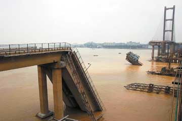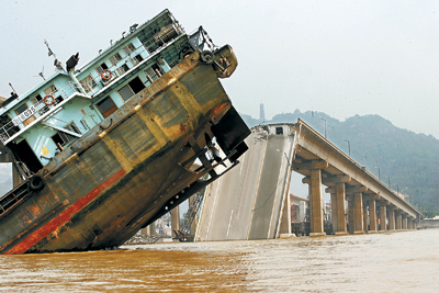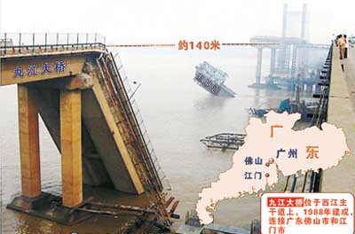 运沙船斜插在江中,其背后是塌掉的九江大桥。15日凌晨5时10分,一艘吨位约1600吨的运沙船撞上325国道广东佛山九江大桥,桥墩被撞断,大桥中段约200米桥面垮塌。事发后,广东和交通部门全力开展搜救工作。九江大桥是跨越西江主干流的特大型桥梁。晶报记者轩慧/摄